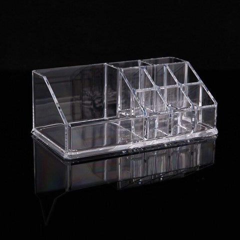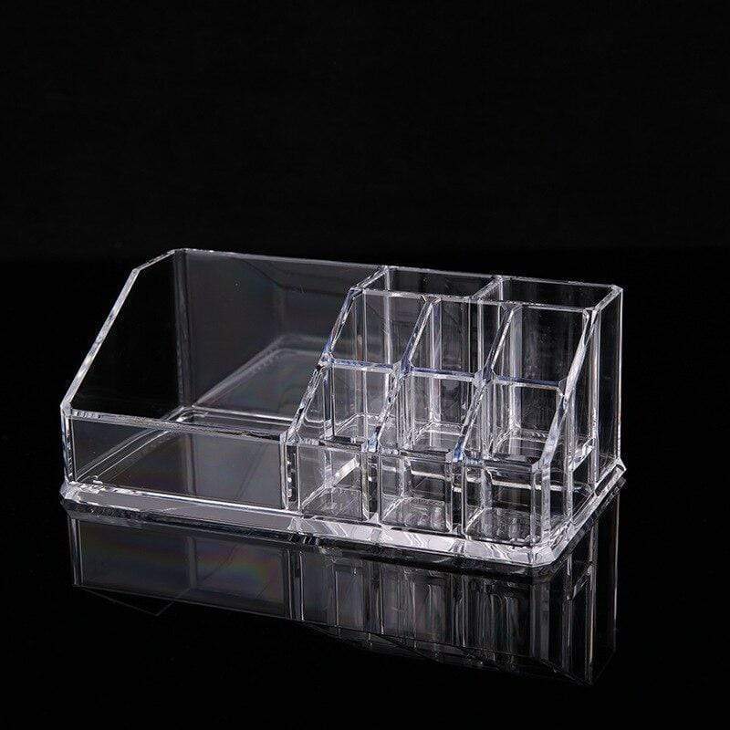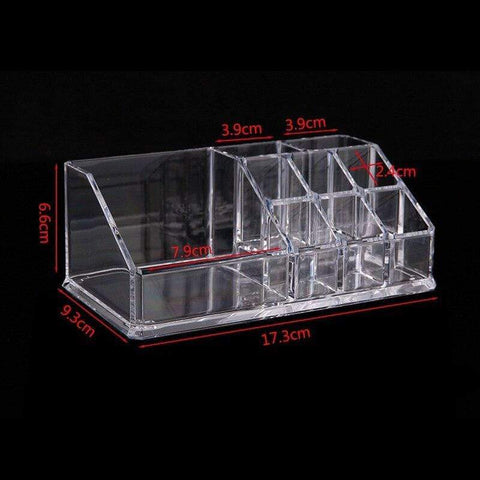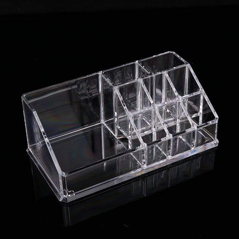 This acrylic makeup and lipstick holder features various compartments of different sizes. It includes 6 small compartments for lipsticks, 2 medium-sized ones, and 1 large one. This makeup organiser can also accommodate other accessories and beauty products.