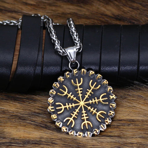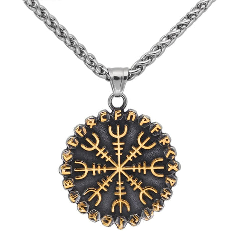 This stainless steel pendant is decorated with the Nordic symbol Aegishjalmur. It was believed that this ancient Viking symbol protected those who wore it. The pendant is also adorned with runic inscriptions.