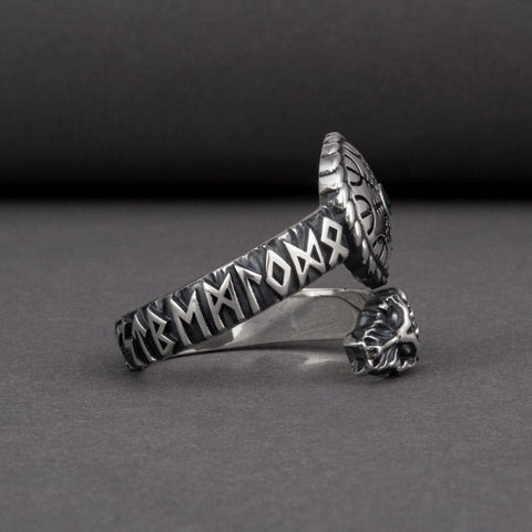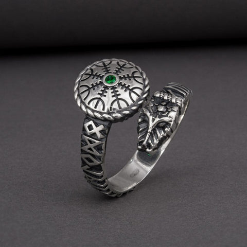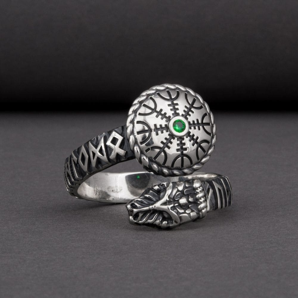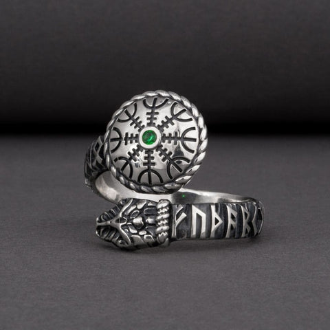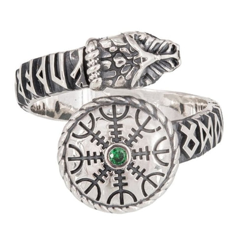 This silver ring, with a snake and the mythical Norwegian symbol Aegishjalmur, is a symbolic representation of this ancient Scandinavian legend. To complete the set, a green cubic zirconia stone has been placed in the centre of the jewellery.