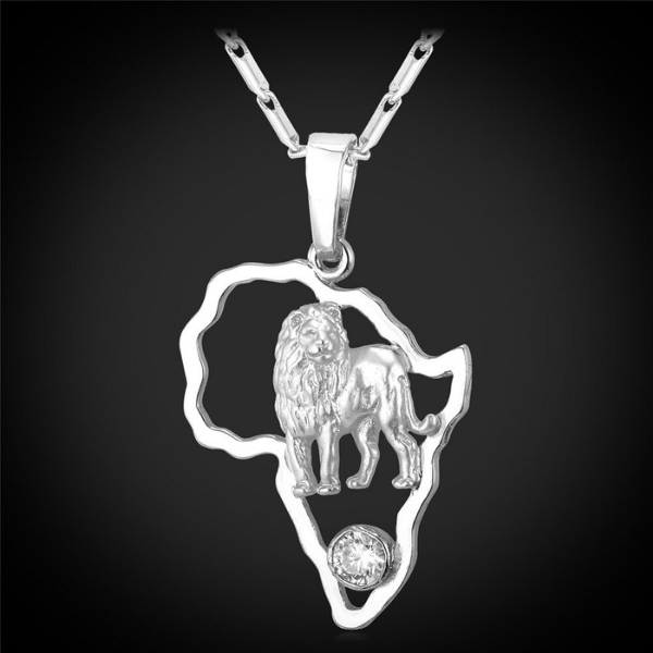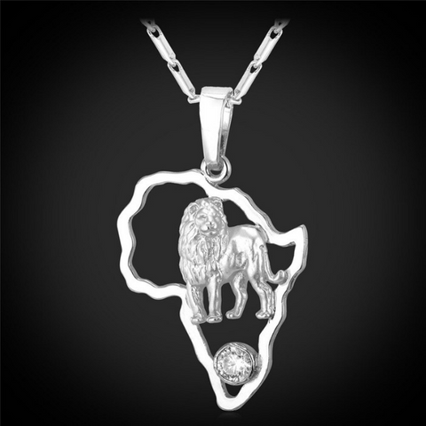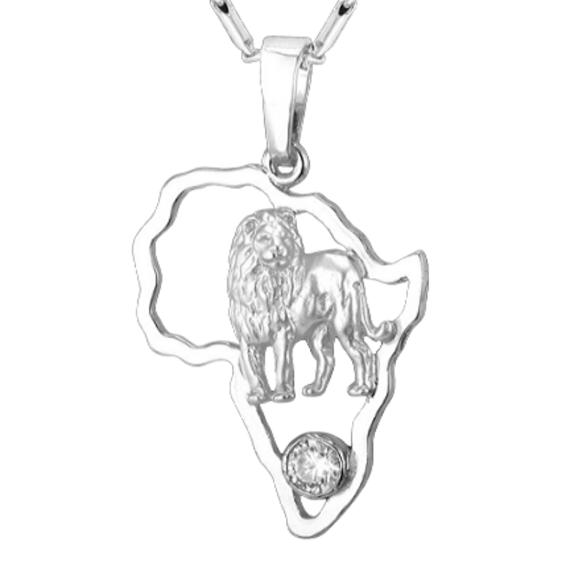 Stunning Africa pendant featuring a lion dominating the continent and a small diamond. Show your loyalty or love for Africa by wearing this unisex silver steel necklace.