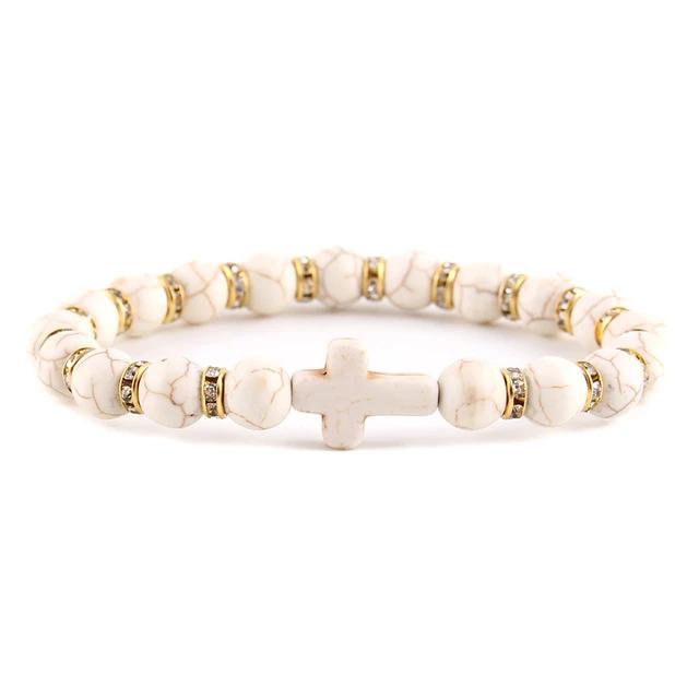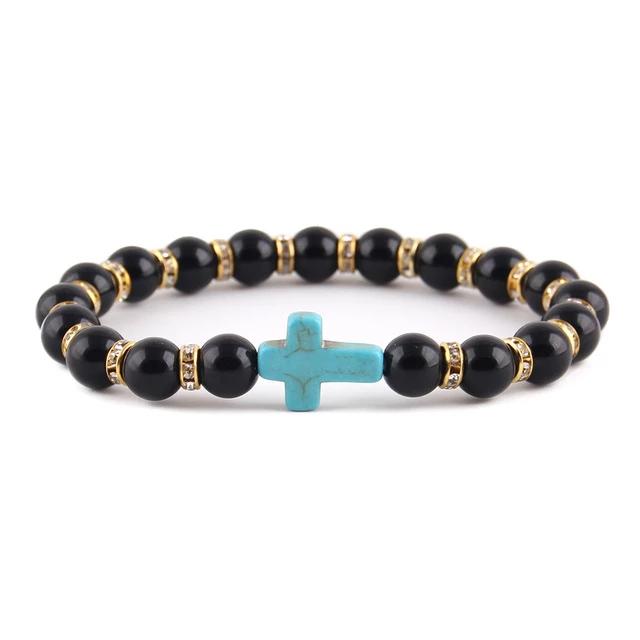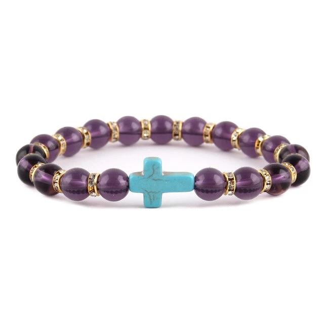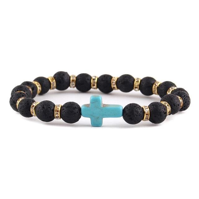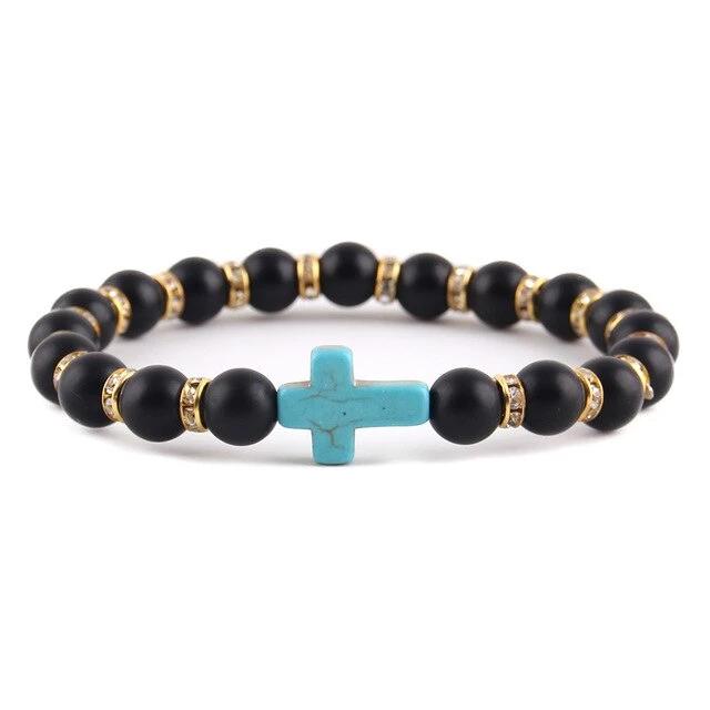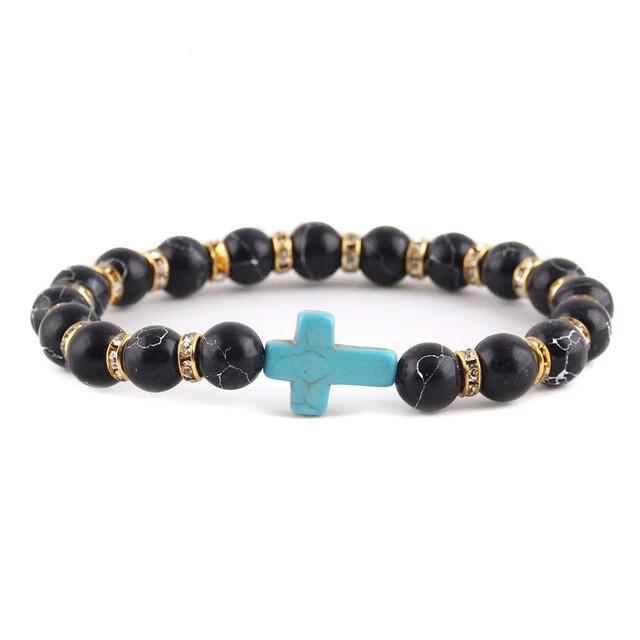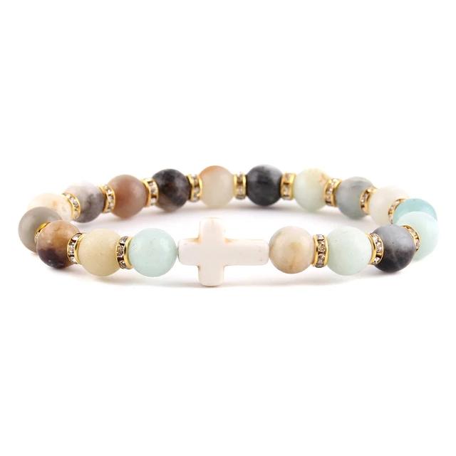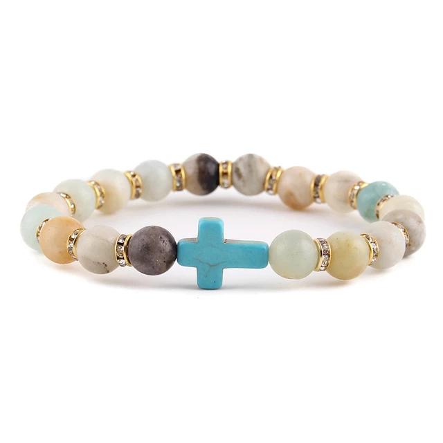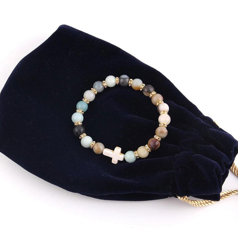 This unisex Christian bracelet made of amazonite is the perfect gift for the religious man or woman you are, aspire to be, or wish to gift it to. Crafted with a sturdy and attractive material, the bracelet features a Christian cross – a symbol of Christ's love – framed by amazonite beads. The amazonite gets its name from the mighty Amazon River, where it was discovered and named. The green hue of this stone, with slightly lighter shades, also reminds of the colour of the river's water.