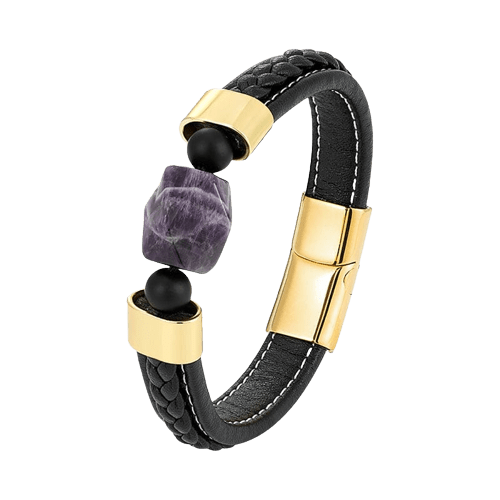 This beautiful bracelet features a stunning amethyst stone, mounted on leather and stainless steel. A perfect accessory for any outfit, the bracelet is sure to add a touch of elegance and sophistication to your look.