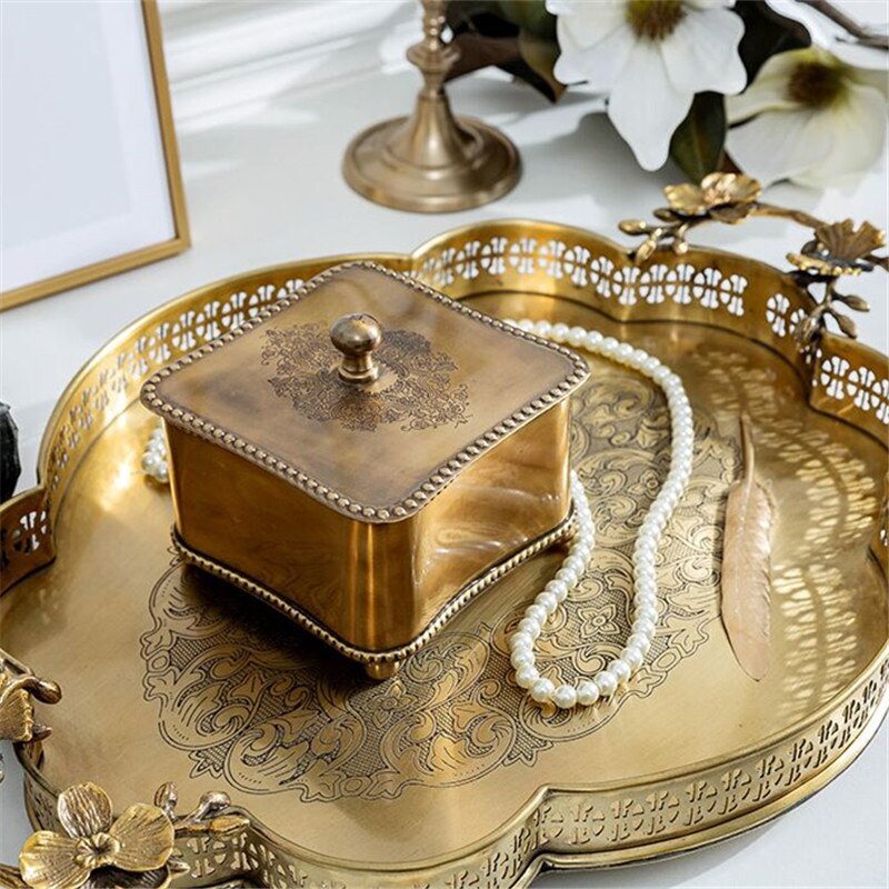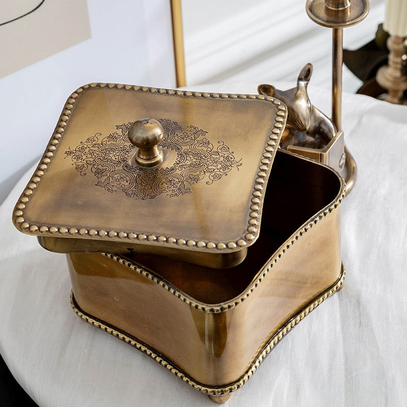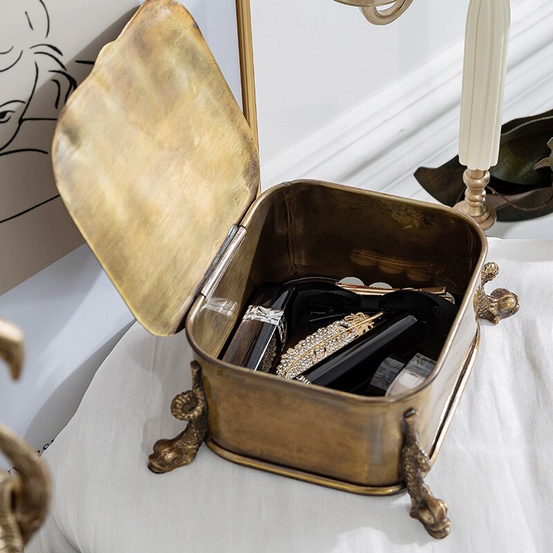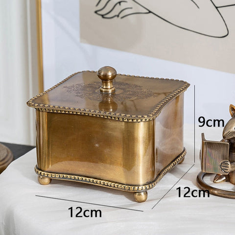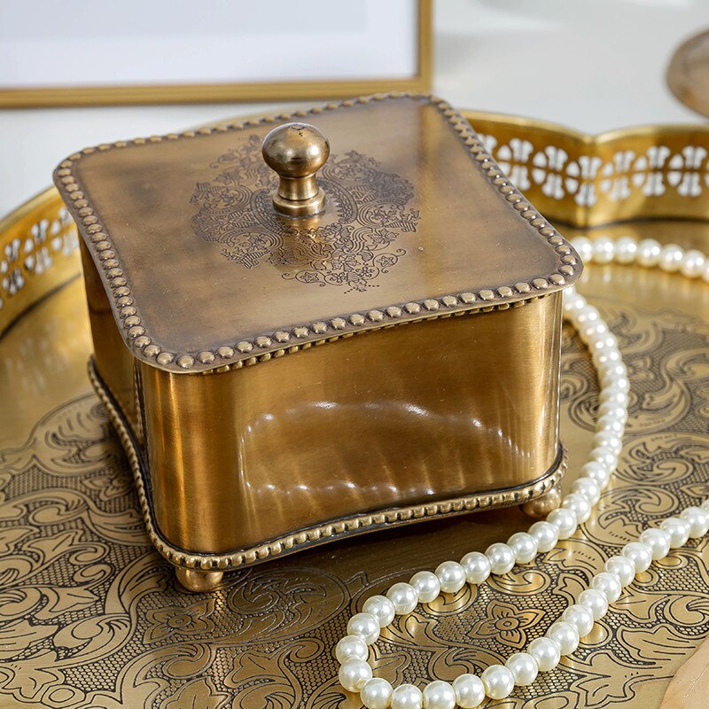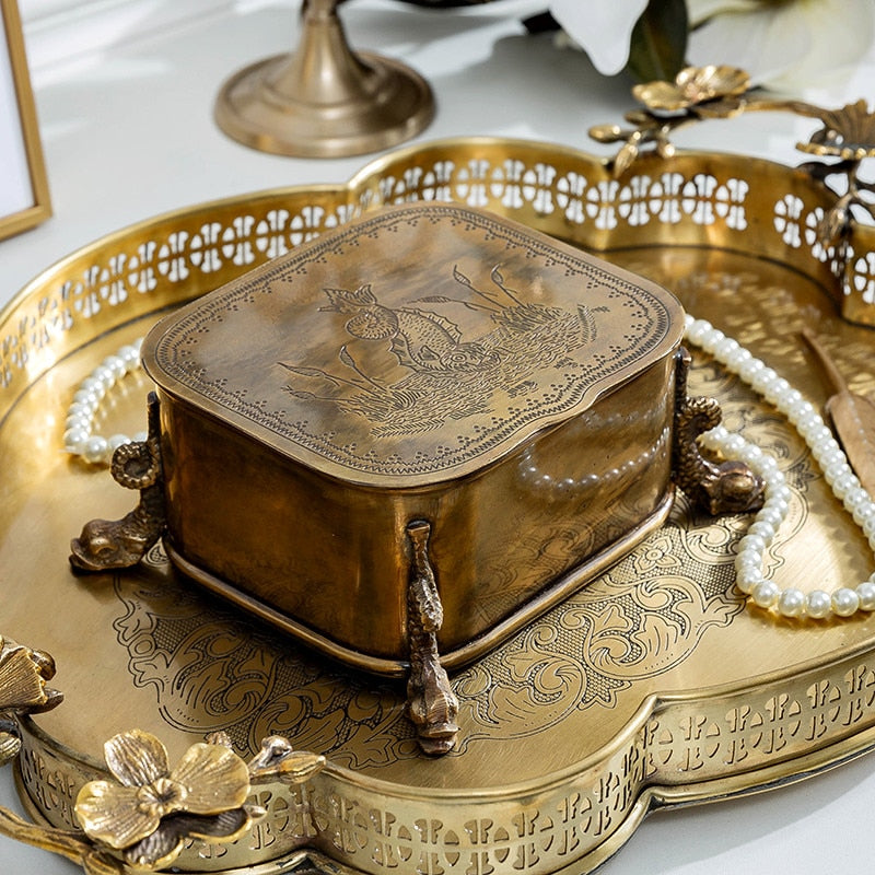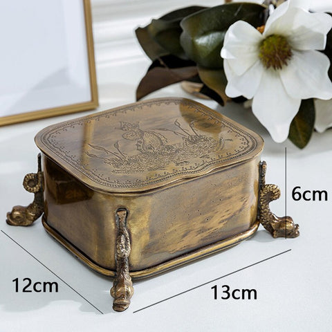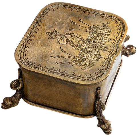 Our stunning Antique Brass Jewelry Box is crafted from high-quality brass and embodies timeless elegance. With its four ornate brass feet, this box adds a touch of sophistication to any space. The lid features an engraved pattern that brings an artistic flair to the design. Not only is this box functional, but its highly decorative appearance also makes it a standout home décor piece. Treat yourself to this exquisite box and add a touch of beauty and class to your jewelry collection.