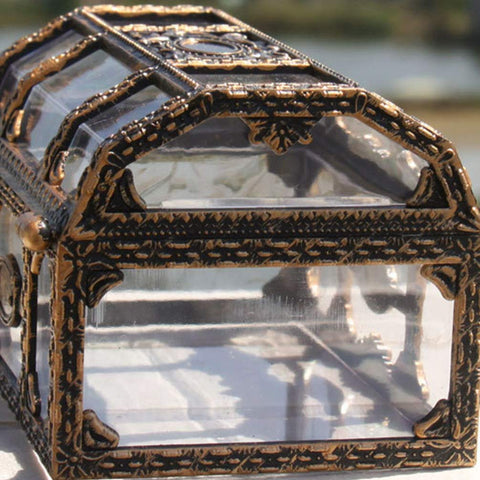 Antique Glass Jewellery Box: Treasure Chest Design, Transparent Glass, Pirate-Themed Trim, Latch Closure. For a Unique Touch of Protection.