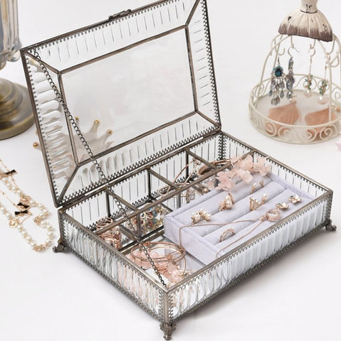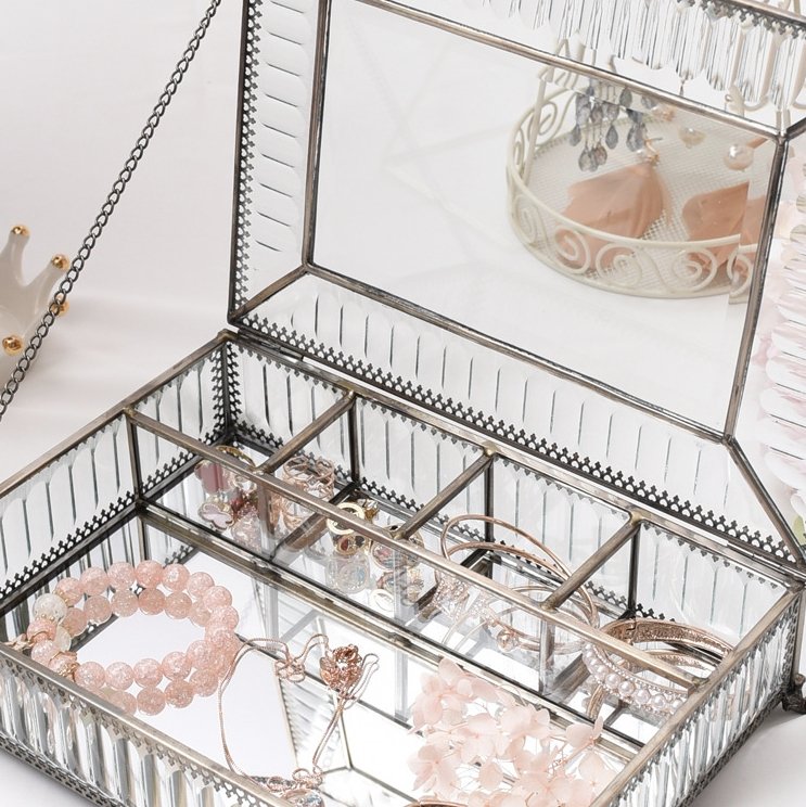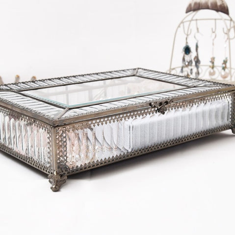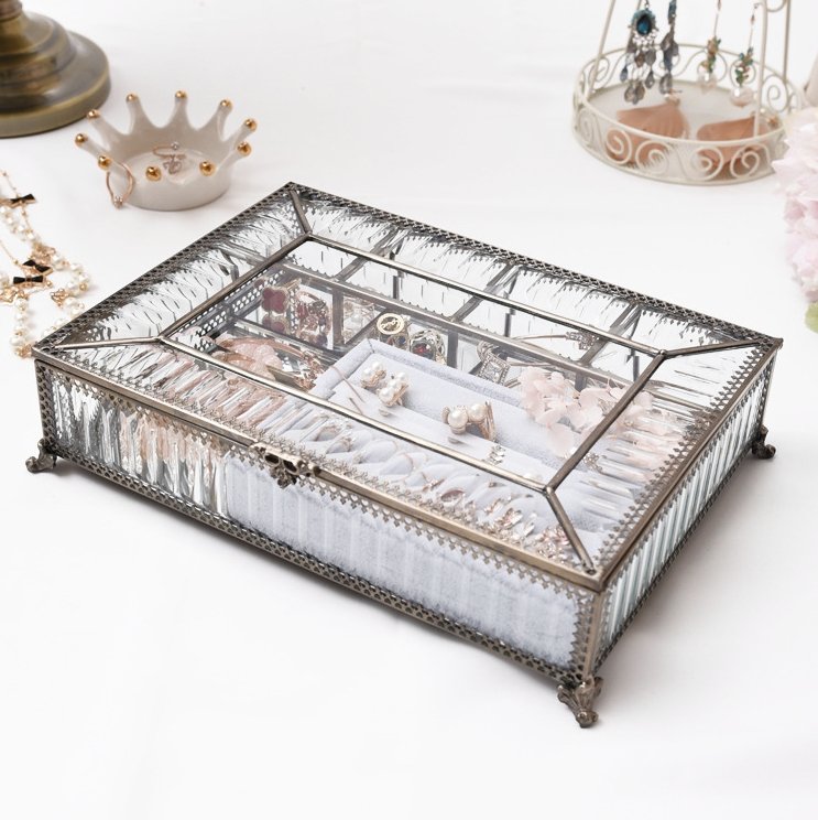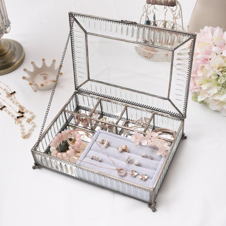 The jewellery box features brass and glass accents that give it an elegant vintage look. The brass details add a touch of authenticity and sophistication, while the glass elements provide transparency and brightness.