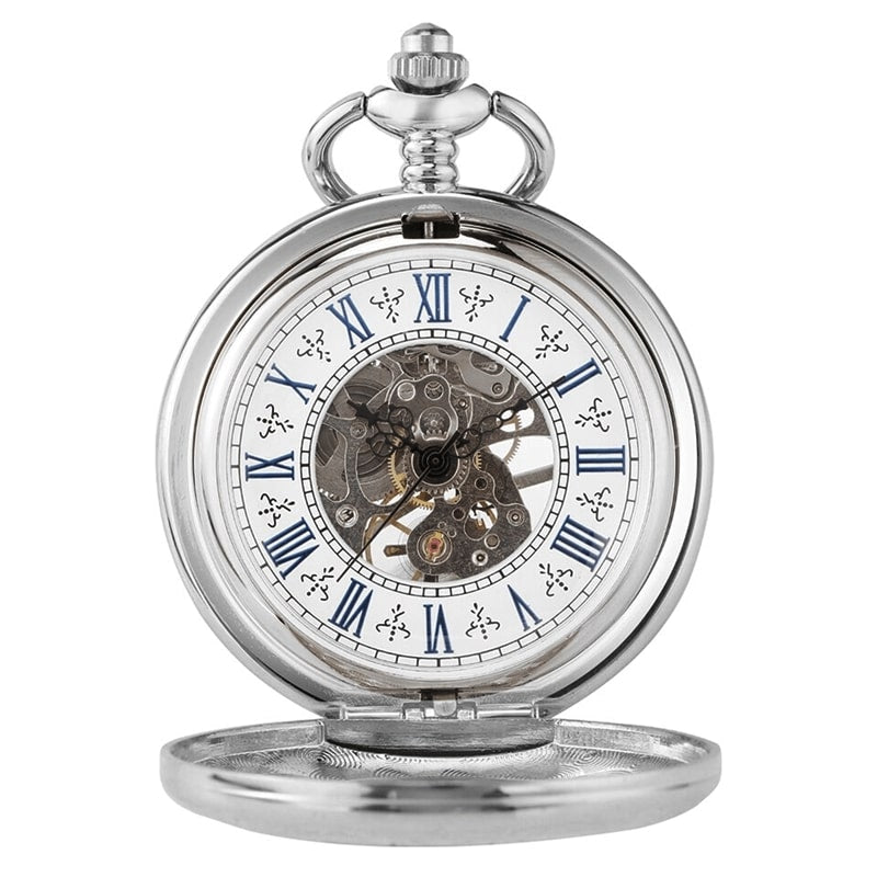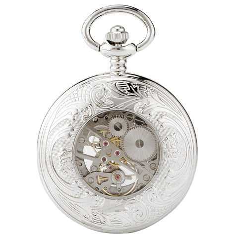 Enter into history and become a true 21st-century gentleman with this antique pocket watch with silver engravings! Its skeleton stainless steel case allows you to view the time through the transparent dial, offering a view of the hand-wound mechanism.