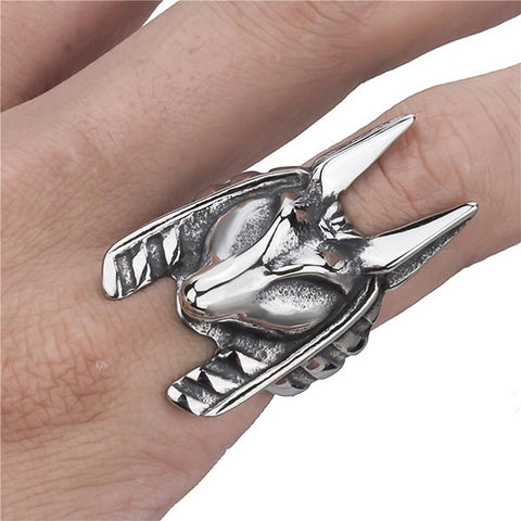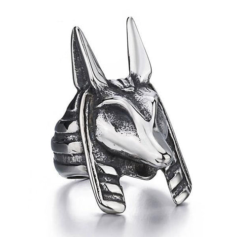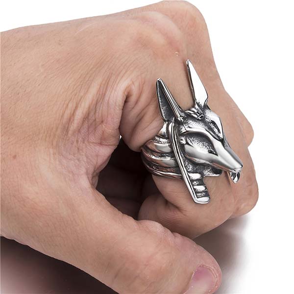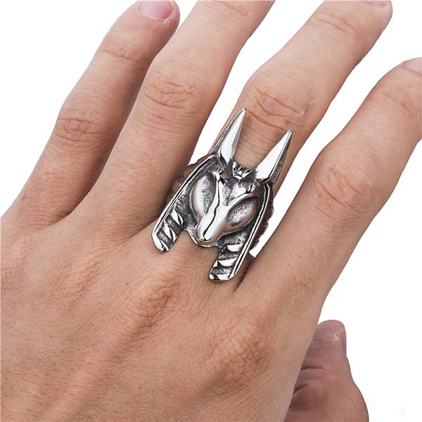 The Anubis Wolf ring elegantly represents the majestic status of the ancient Egyptian funerary god. This symbolic deity, also known as Anpu, is often depicted as a black canine or as a man with the head of a dog.