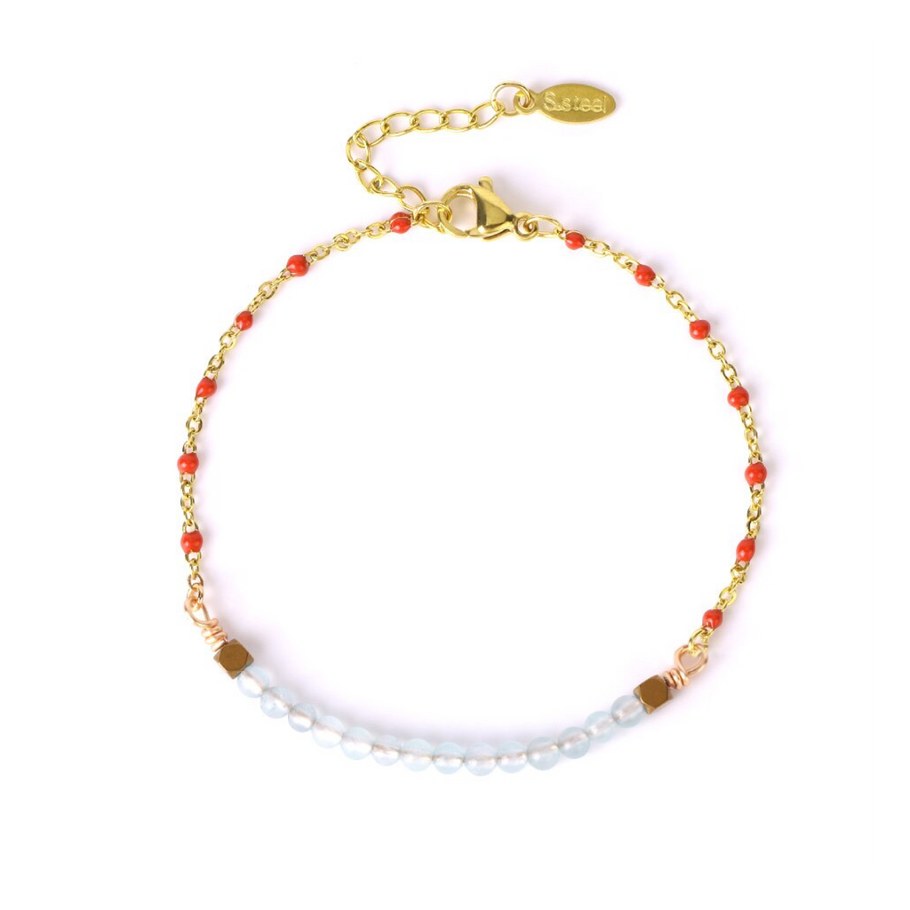 Introducing our elegant bracelet with aquamarine pearls and gold accents! This bracelet is the perfect way to add a touch of luxury to your everyday look. The bracelet features beautiful aquamarine pearls. It's adjustable so you can find the ideal size and the clasp ensures it stays securely in place.