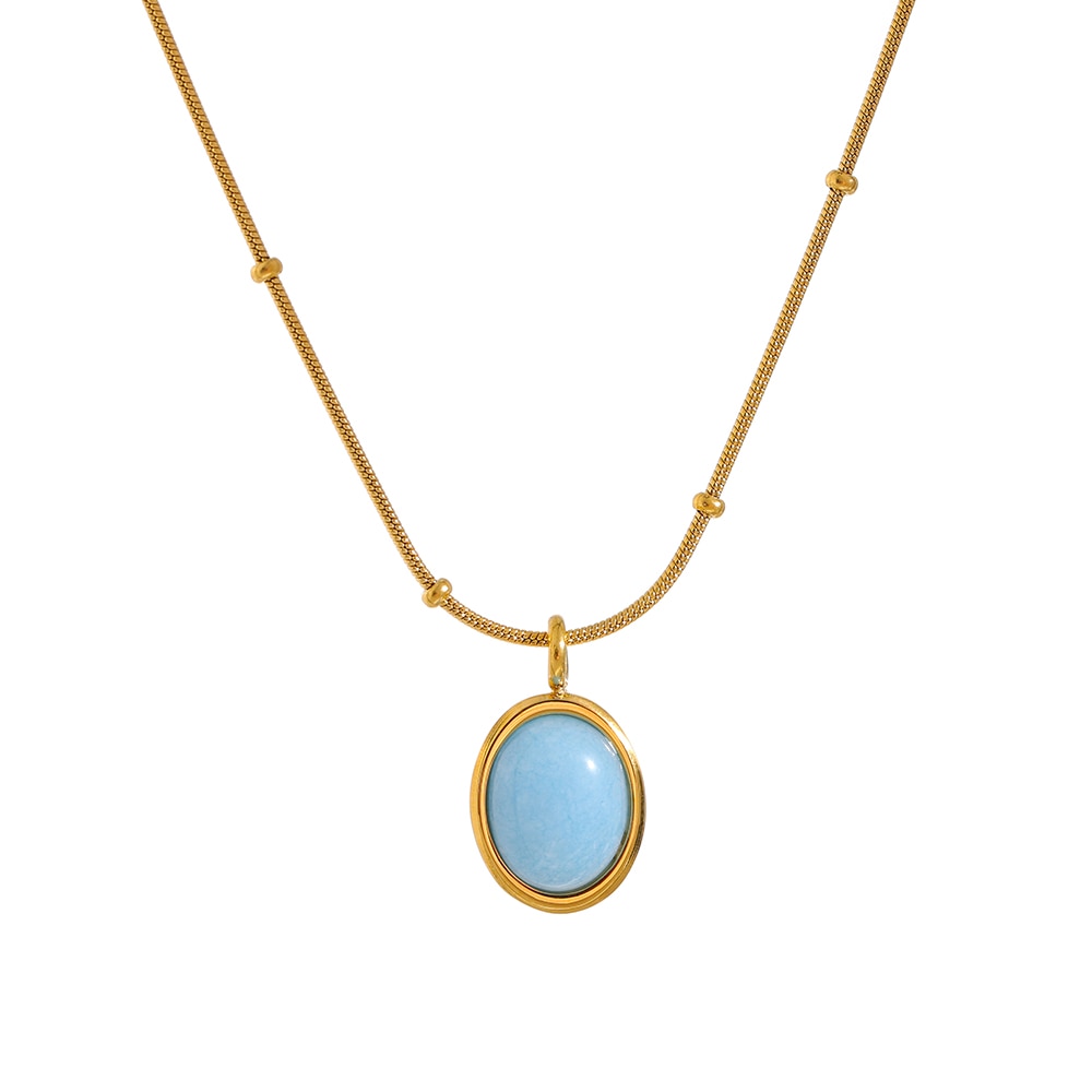 We present our latest necklace: the Aquamarine Oval Necklace. This stunning piece pairs well with any look, be it elegant or more understated. The aquamarine pendant stands out for its striking blue hue, while the golden stainless steel chain adds a touch of sophistication.