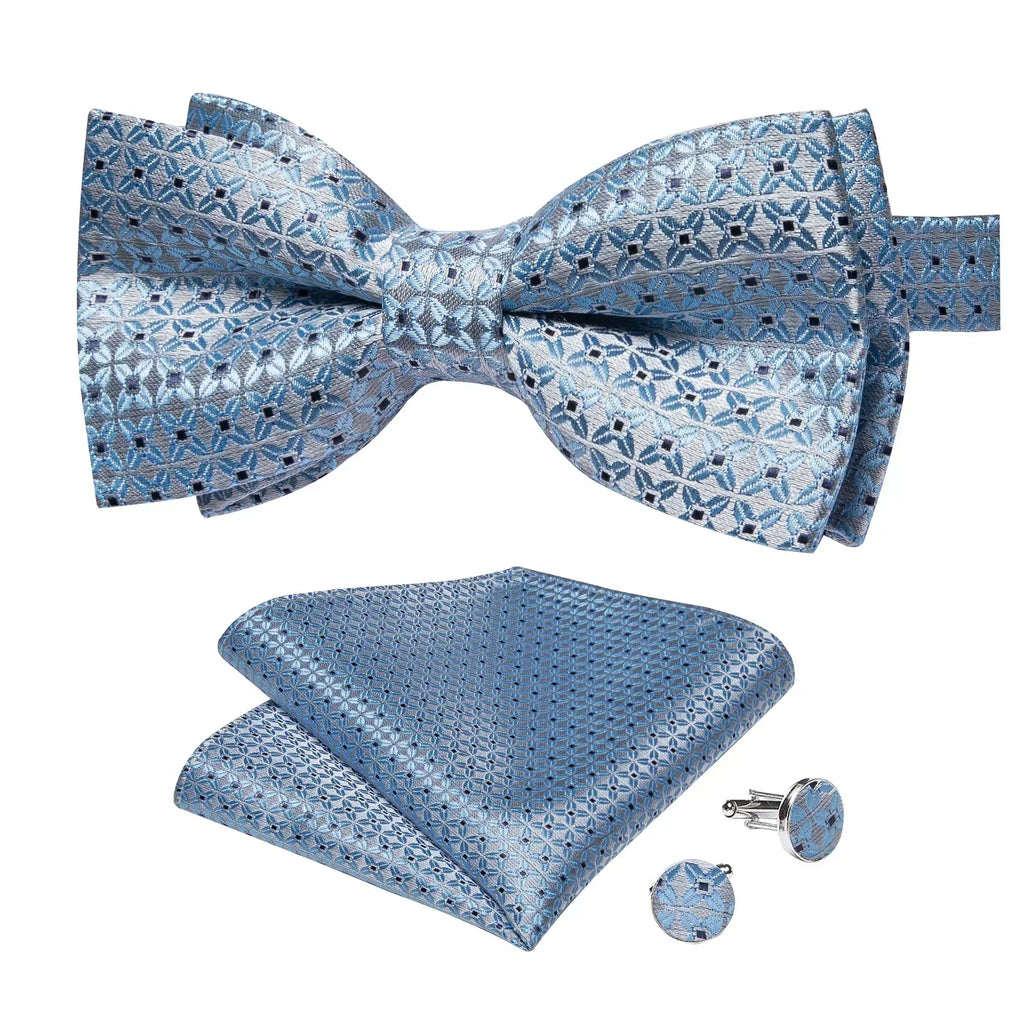 The set includes: bow tie, pocket square and 2 cufflinks.