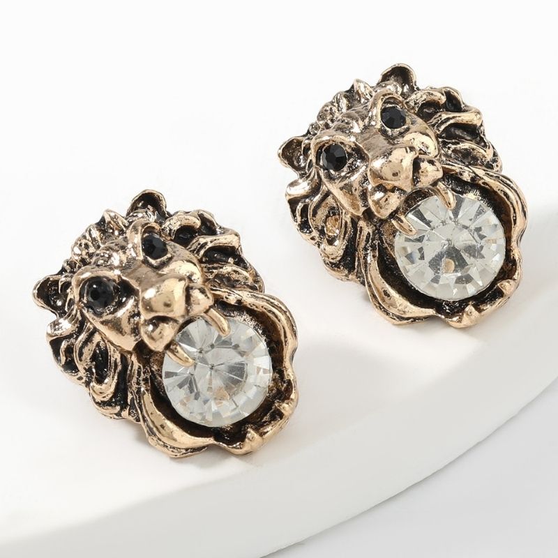 A gorgeous pair of earrings with a baroque lion theme! An original and expressive set, featuring a raised lion and its piercing gaze! The strength of your totem animal manifests! A diamond gives the final touch to this authentic and elegant earring. Suitable for both girls and boys. Comfortable to wear. Easy to put on.