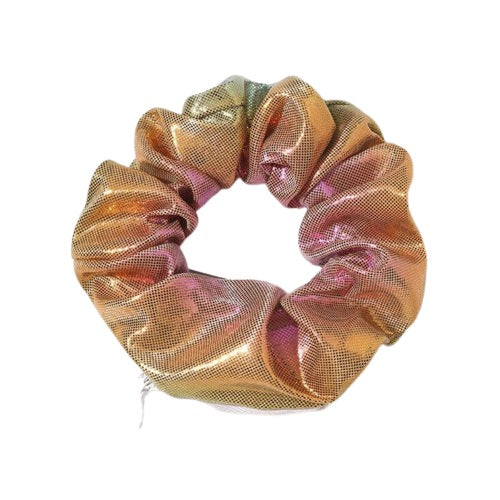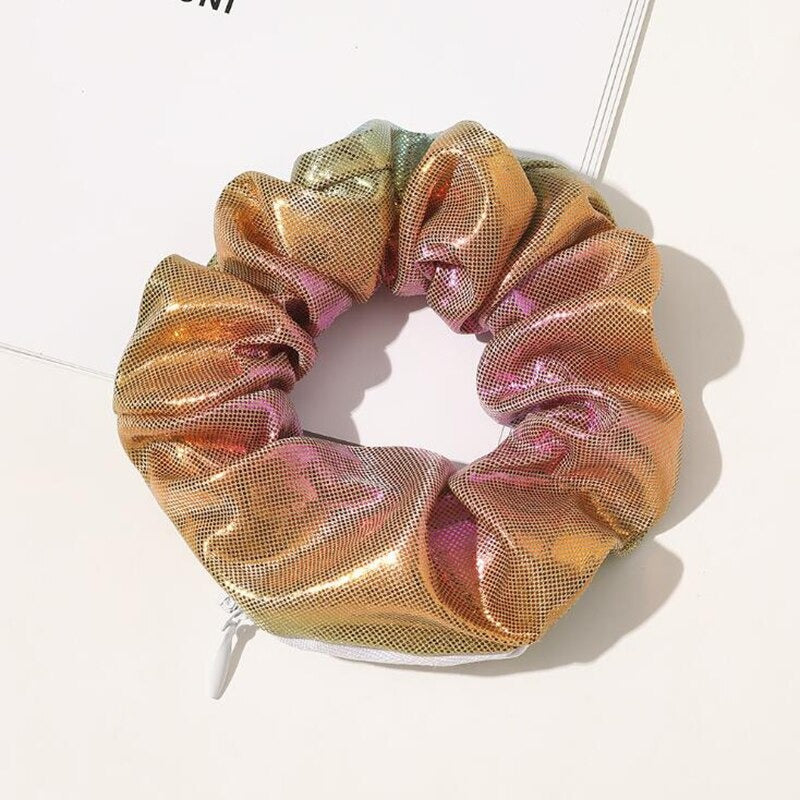 Bright and elegant style for this golden scrunchie with storage pocket. A hair elastic that hides a mini pocket with zipper, ideal for storing notes, coins, or small valuable objects.