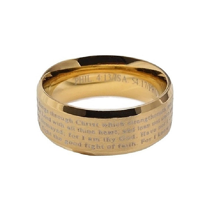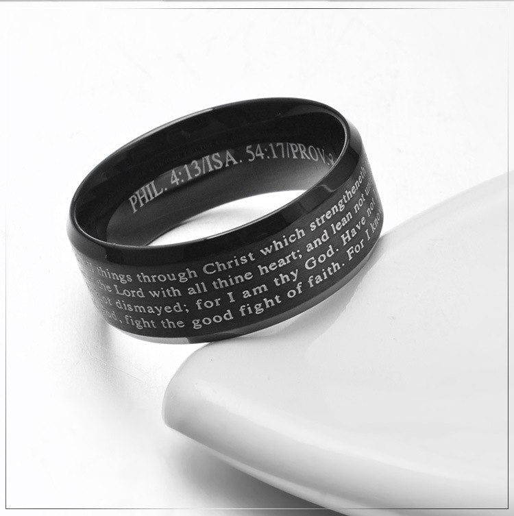 A religious titanium ring, finely engraved with quotes from the Holy Scripture (Philippians 4:13: "I can do all things through Christ who strengthens me" and Isaiah 54:17: "No weapon that is formed against you will prosper; and every tongue that rises against you in judgement, you shall condemn. This is the heritage of the servants of the Lord, and their righteousness is from me, says the Lord"). Carry with you the protection and love of Christ at all times of your day.