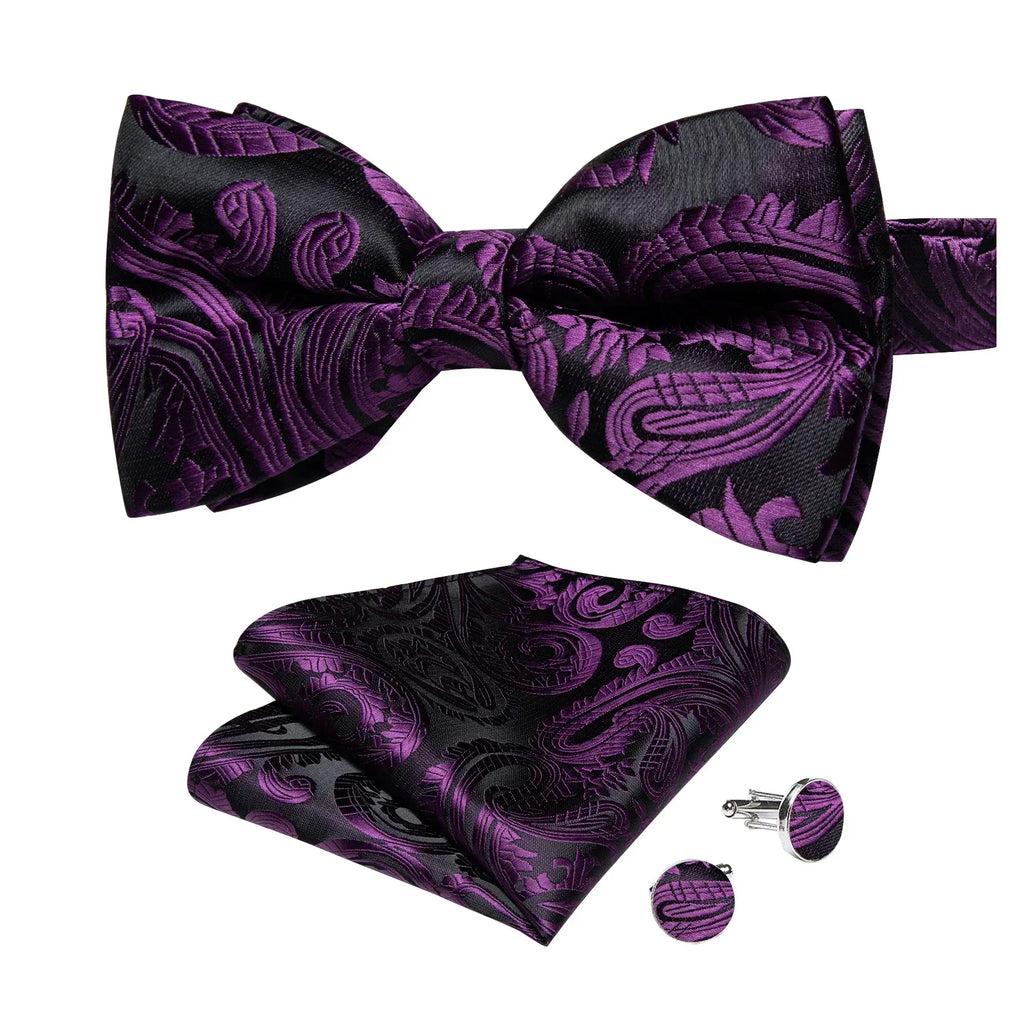 Dive into elegance with this black and purple paisley patterned bow tie. This sophisticated model is crafted with high-quality materials that ensure maximum comfort. Its paisley pattern adds a touch of refinement to your look, while the black and purple colour combination highlights a modern style.