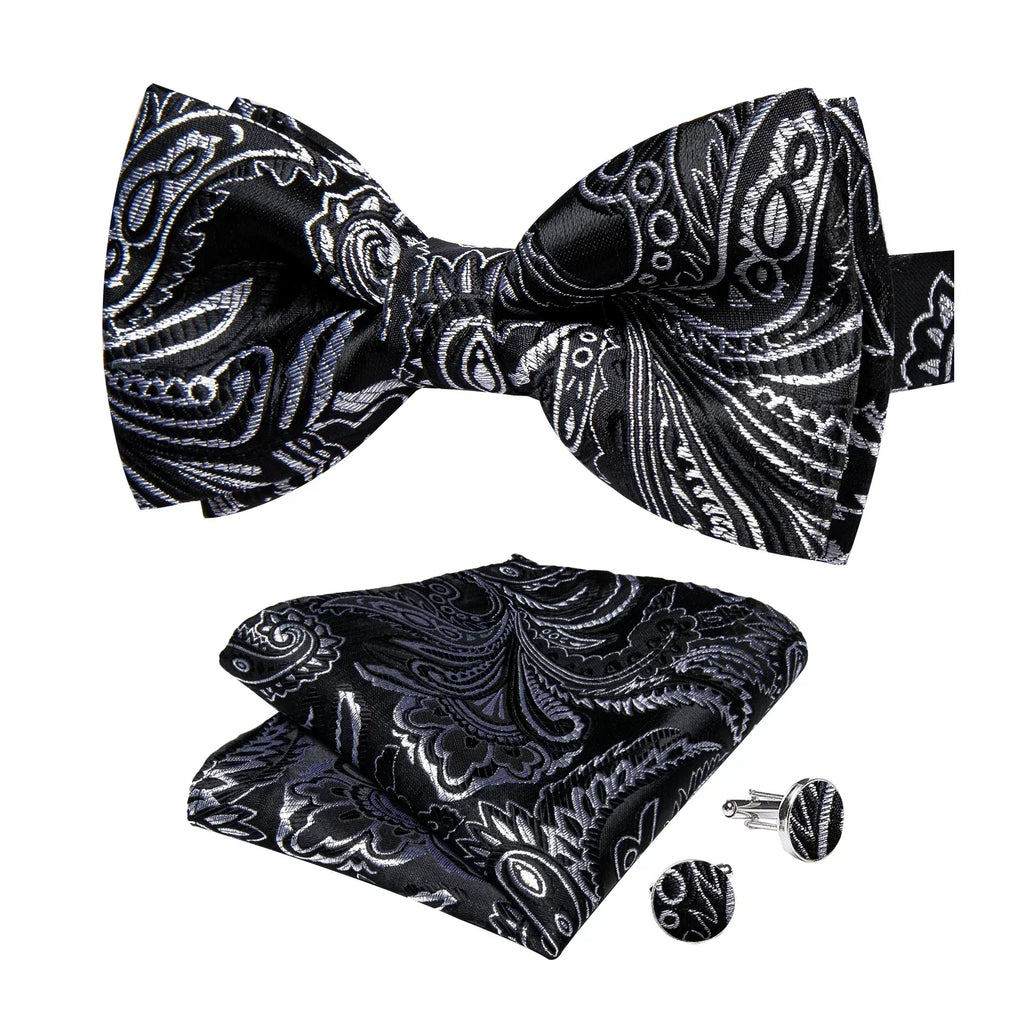 The set includes: bow tie, pocket square, and 2 cufflinks.
