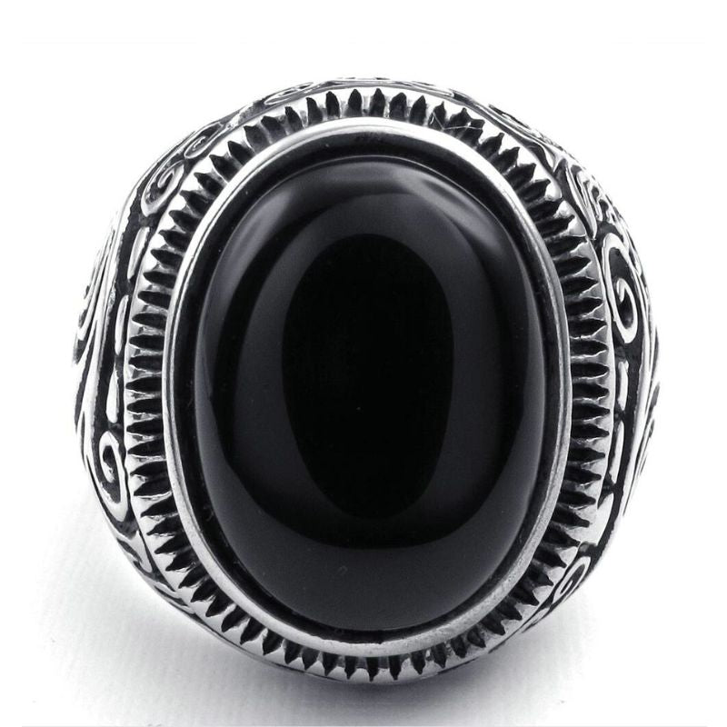This signet ring features an oval black onyx stone, known for its protective effect. It repels negative energies and brings stability by calming your fears. The ring is beautifully decorated with floral motifs. The silver color makes it easy to match with other jewelry, such as necklaces or bracelets.