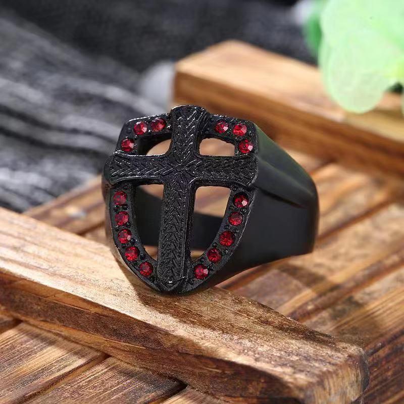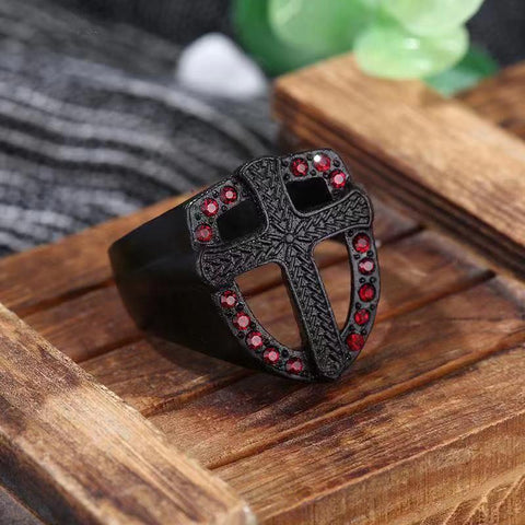 Black Religious Ring for Men with Vibrant Red Cubic Zirconia Gemstones