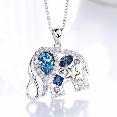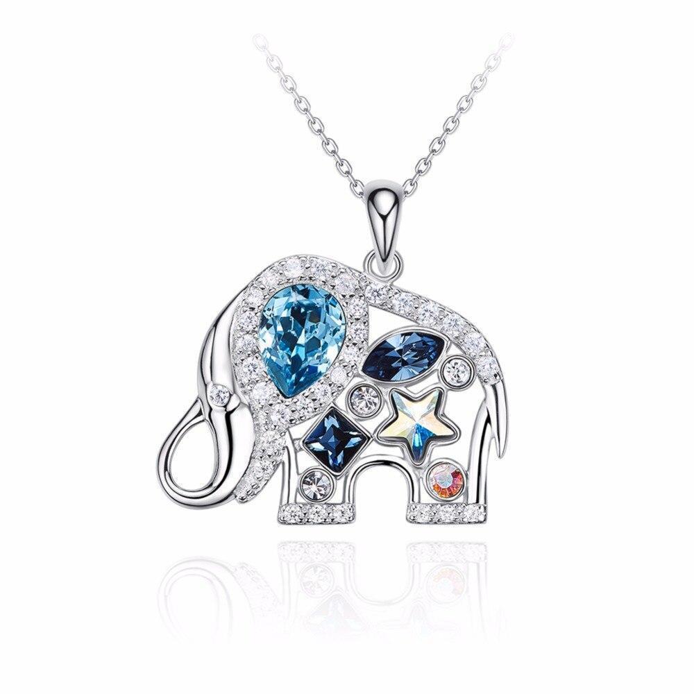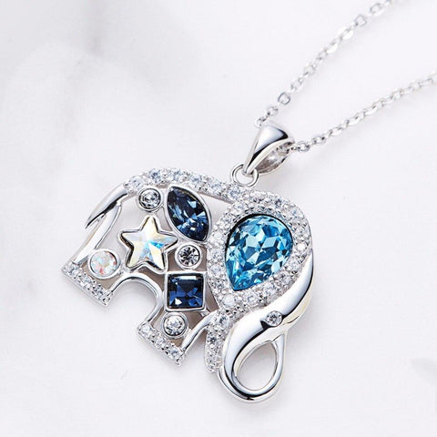 Introducing the silver elephant necklace adorned with dazzling blue and white crystals. A shiny and sparkling pendant that stylishly decorates your chest.