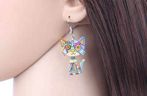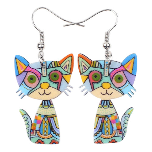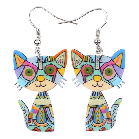 If you want to add a splash of colour to your look, these predominantly blue mosaic-shaped earrings with a cat motif are perfect.
