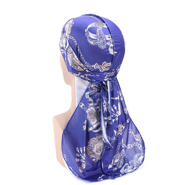 Blue Durag with various patterns, a unisex accessory that helps keep hair in place and adds an unusual fashion touch.