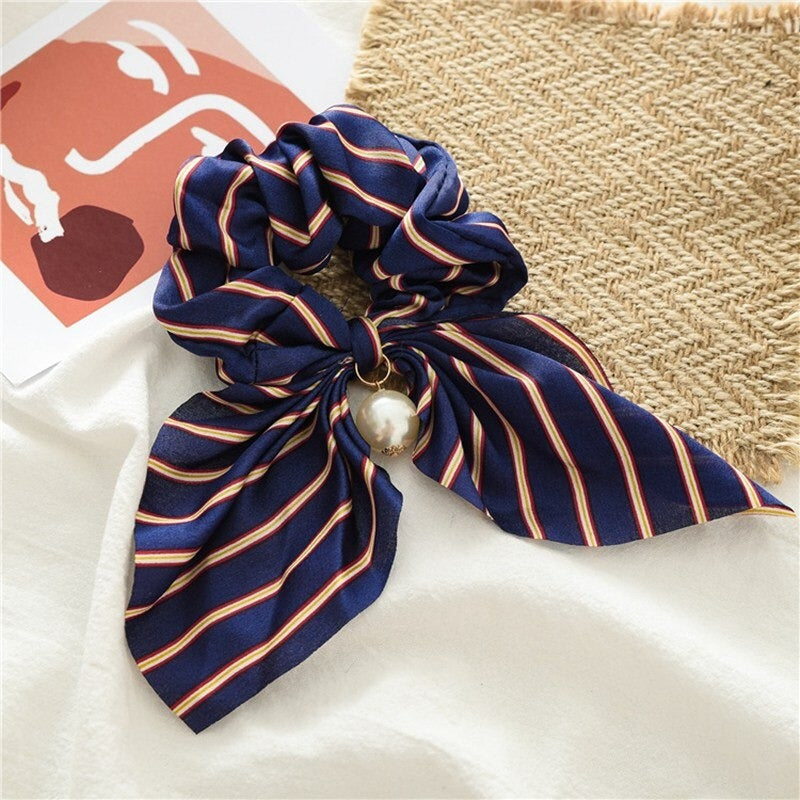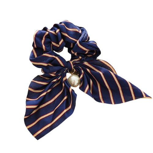 Blue hair elastic with simple and striped designs. The bow is adorned with a pearlescent detail. Adopt this new fashionable accessory, which looks just as elegant in an urban daytime look as in festive evening hairstyles.