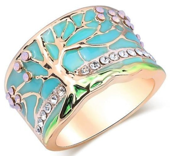 This incredible Tree of Life ring is a stunning combination of gold and sky blue! A series of zirconia crystals adorn the contours of the ring.