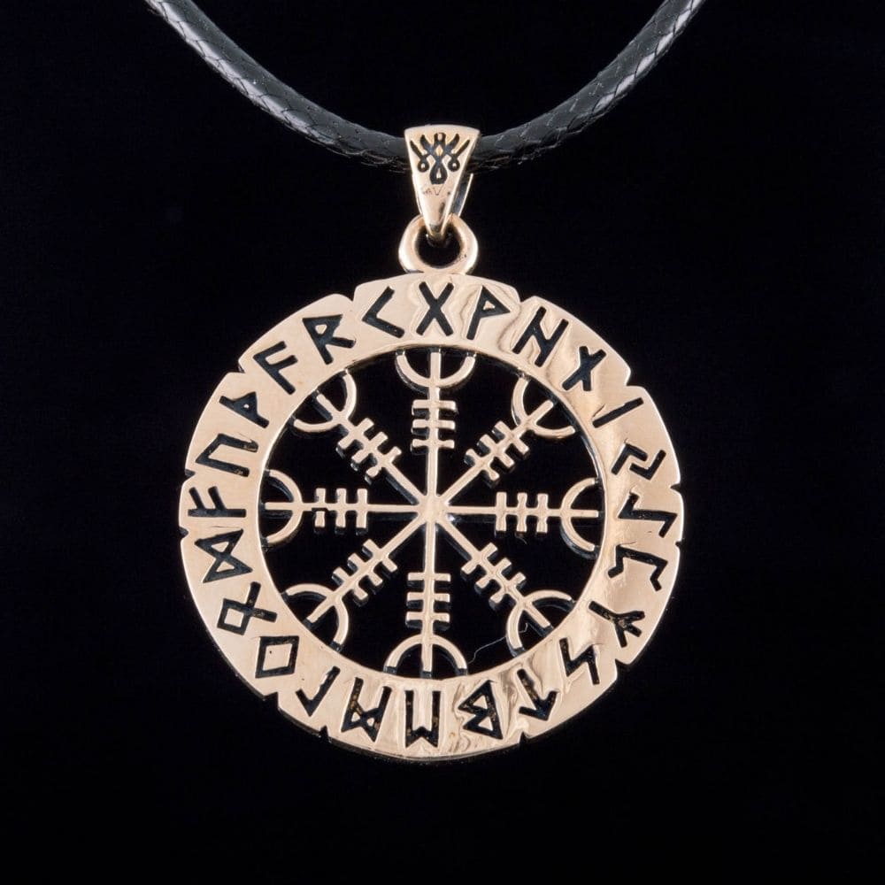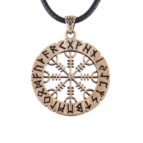 Bronze Viking pendant, featuring the Vegvisir symbol — the Viking compass surrounded by runes. This pendant is handmade with an exceptional level of detail and creativity. It pays tribute to this magical Icelandic symbol, designed to help the wearer find their way even in the worst weather conditions. The original image of the Vegvisir is found in the Huld manuscript, accompanied by the following statement: