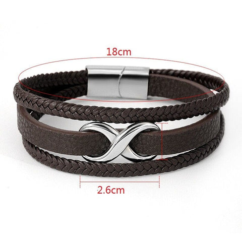 If you're looking for a small, quality leather bracelet featuring an infinity symbol, this is the perfect choice for you. This bracelet showcases an infinity symbol and two braided straps of brown leather.