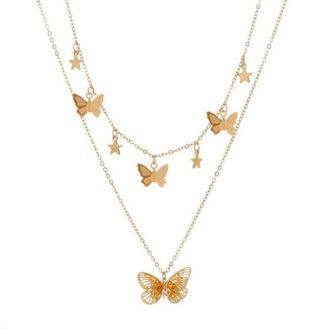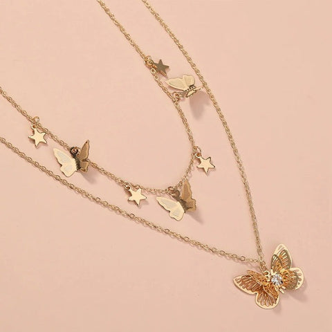 This charming necklace features two chains that elegantly frame your chest. The pendants have butterflies and stars.