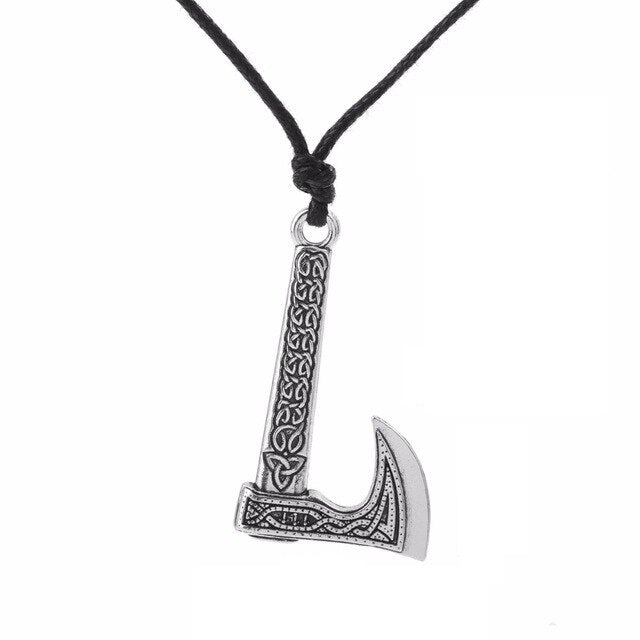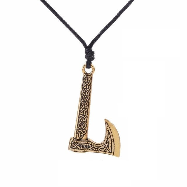 The patterns of this axe-shaped necklace are reminiscent of the interlaced designs typical of Celtic art.