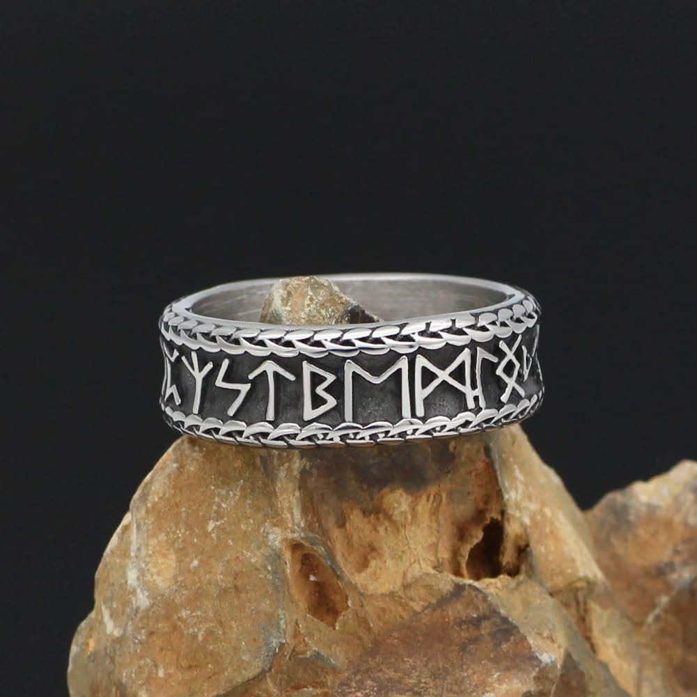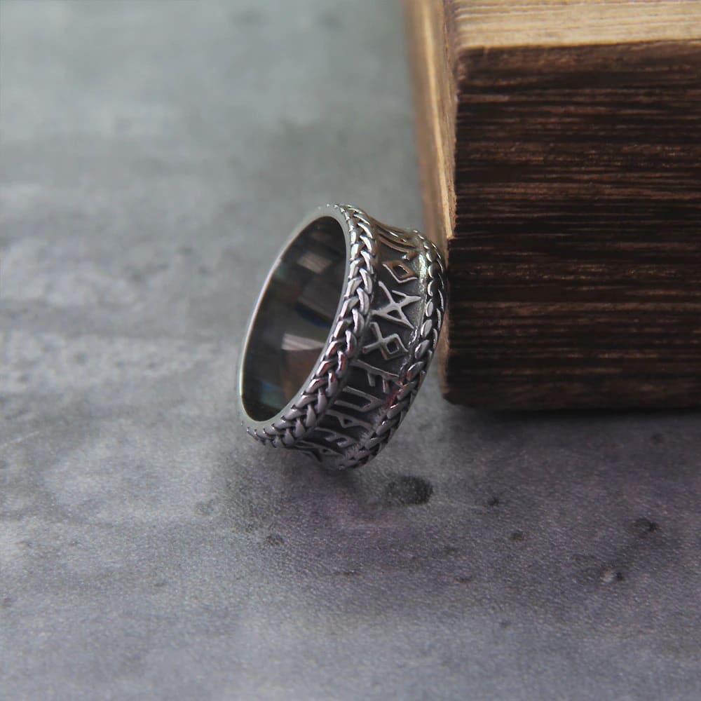 The runes surrounding the ring come from the Futhark runic alphabet. This ancient Nordic alphabet was used on rune stones and inscriptions. It was widely used in Northern Europe during the Viking Age. Even today, these mysterious letters are associated with magical properties of protection. Runes were traditionally used in divination rituals to predict the future or ward off evil spells.