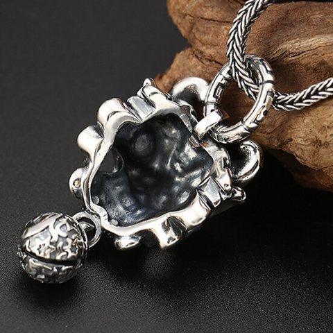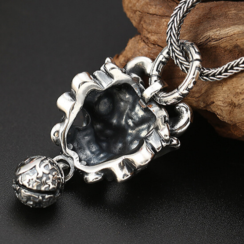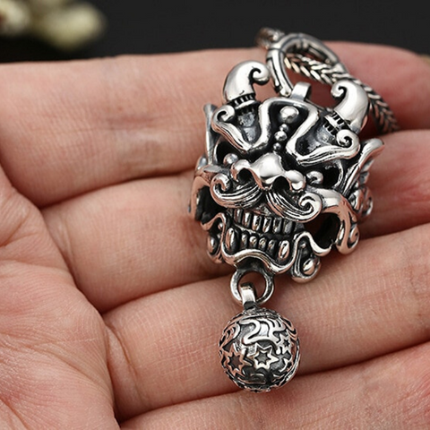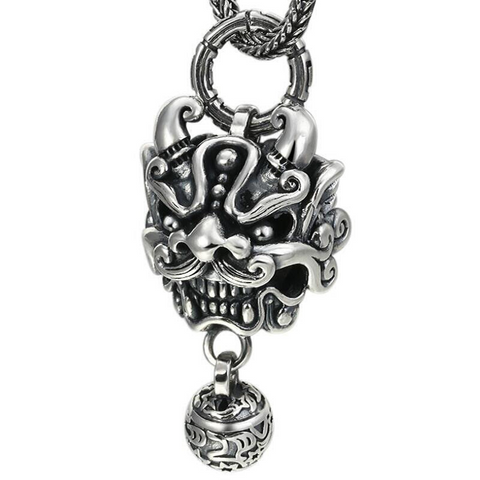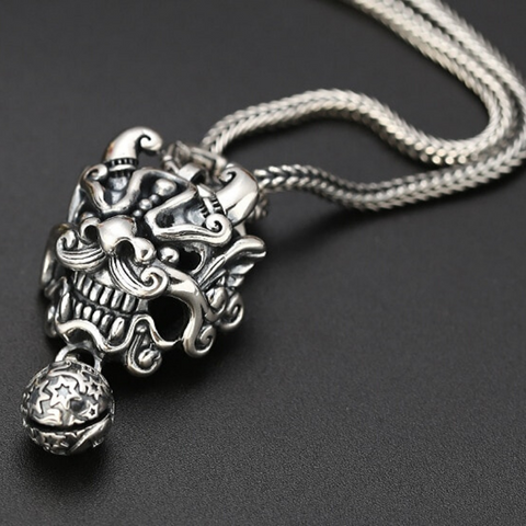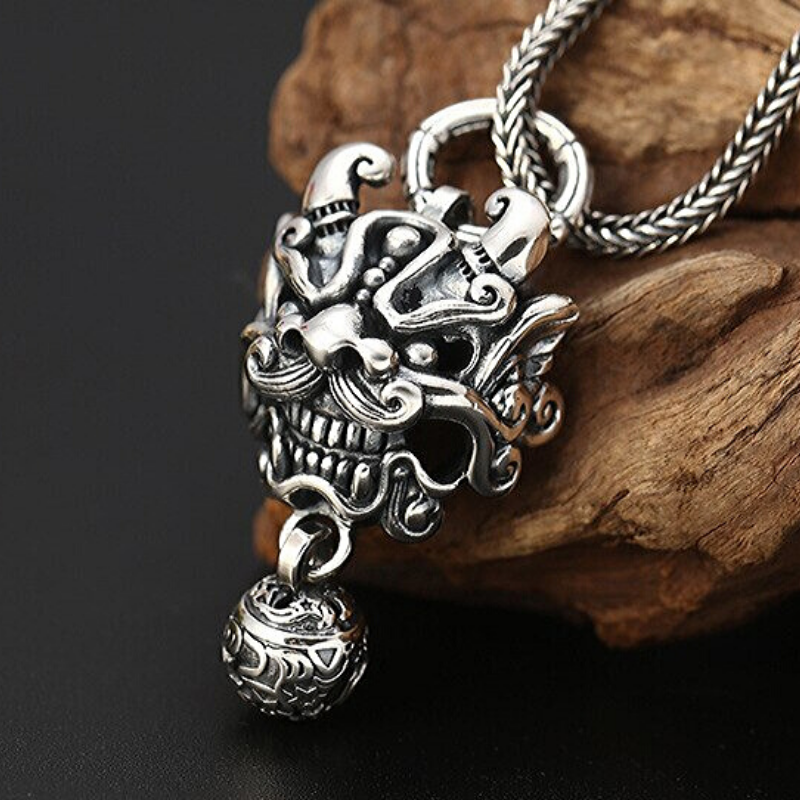 Stunning necklace with a Chinese lion head pendant with whiskers, showcasing a big smile and a mischievous look! We adore the extremely precise details and this beautiful and very special head, whose demonic ball protects the wearer of this men's necklace from all of life's misfortunes. Genuine 925 silver.