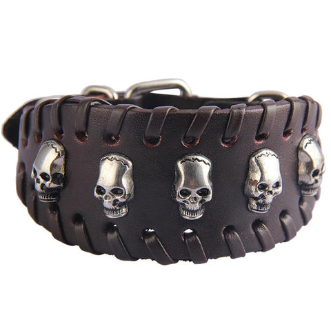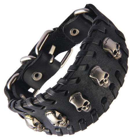 This classic gothic style bracelet features five steel skulls affixed with studs to ensure durability and stability over time. The bracelet is easily adjustable thanks to the strap with holes, ensuring a perfect fit on your wrist.