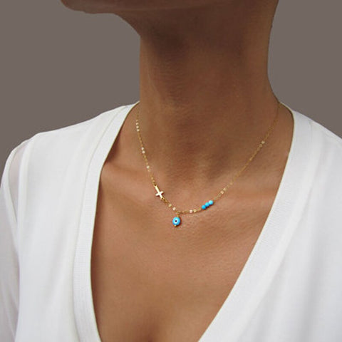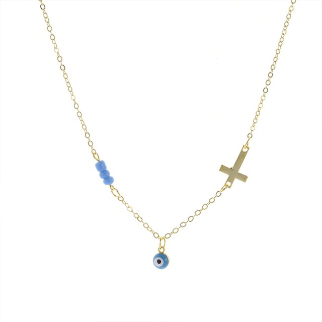 This necklace with a cross and an eye is ideal for wearing to mass, where it expresses your faith and devotion. It's perfect for women who want to add a bohemian and spiritual touch to their style. It is available in silver or gold tones, with a touch of blue, so you can choose the colour that best suits you.
