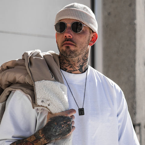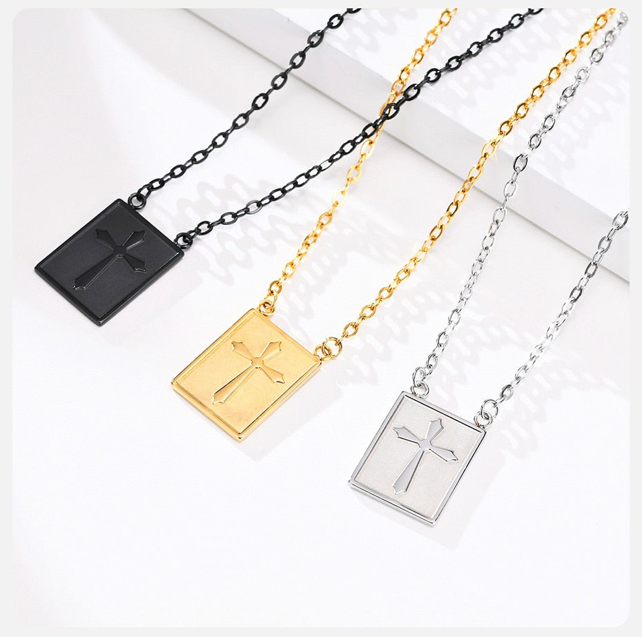 This necklace, entirely made of stainless steel, is a piece of jewelry in the shape of a scapular. The scapular is traditionally a religious garment, consisting of two strips of fabric that fall over the chest and back. We wanted to recreate this object in the form of jewelry. This pendant with chain, perfectly engraved with the cross of Jesus, is your daily ally in faith.