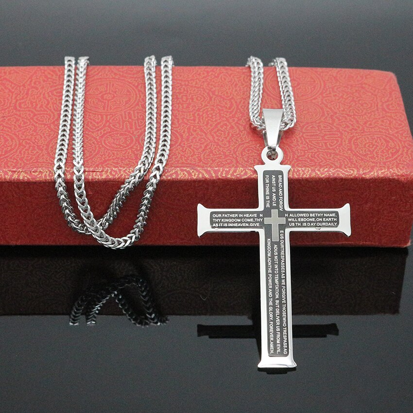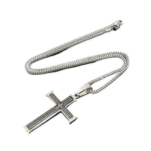 This magnificent prayer cross necklace is a sacred accessory that accompanies you in your moments of prayer. Made from high-quality stainless steel, it's resistant and durable. The cross is adorned with the Lord's Prayer in English, an essential prayer of our Christian faith.