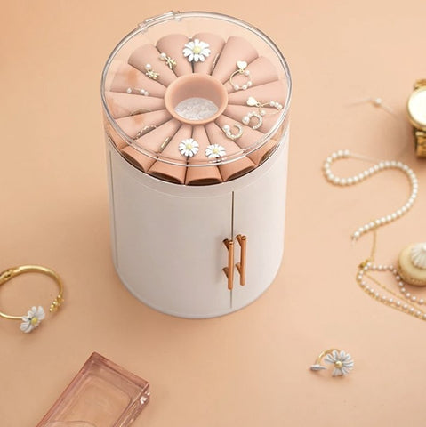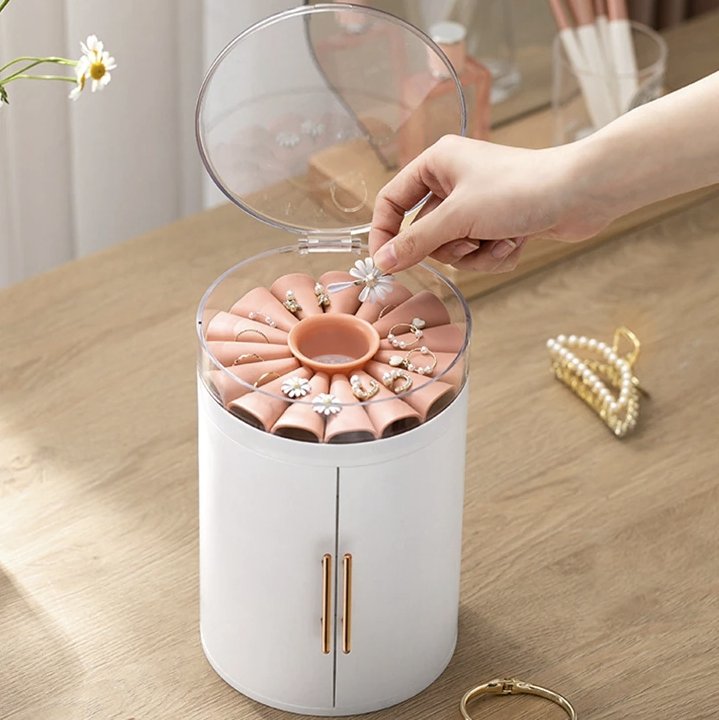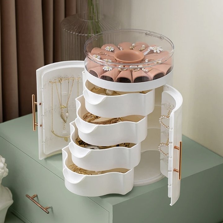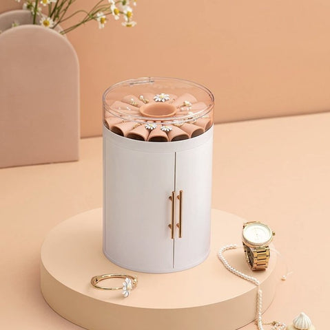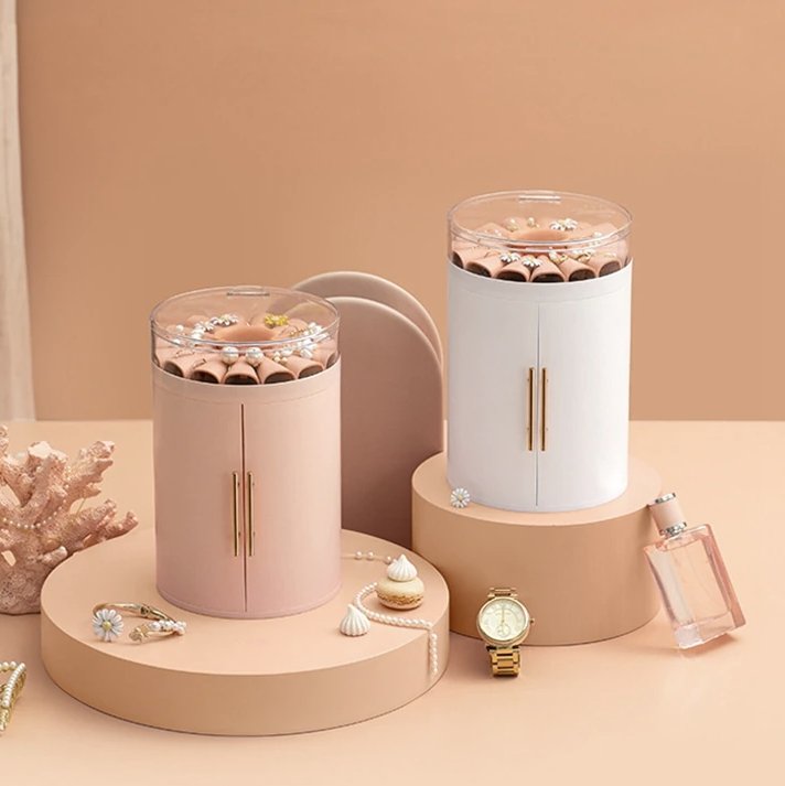 This cylindrical jewellery box is unique and stylish. If you have a collection of necklaces or sautoirs, this is the perfect choice – it features plenty of hooks to hang them, 30 in total. In addition, four removable drawers provide ample space for other items such as rings, earrings, watches or cosmetics. The cylindrical shape with its two opening cuffs is highly decorative. The lid is made of transparent material, allowing a clear view of your jewellery.