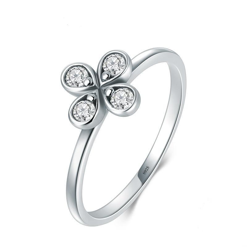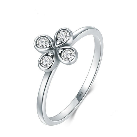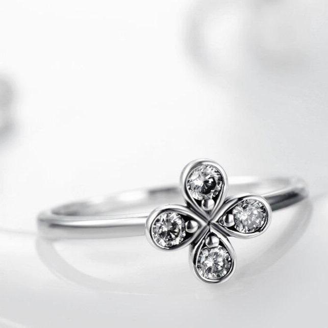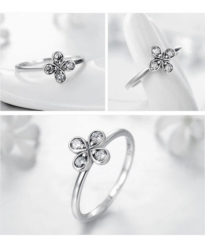 This ring features a polished sterling silver setting and a small four-leaf clover for luck. The clover is decorated with dazzling sparkling crystals, giving it an elegant and charming look.