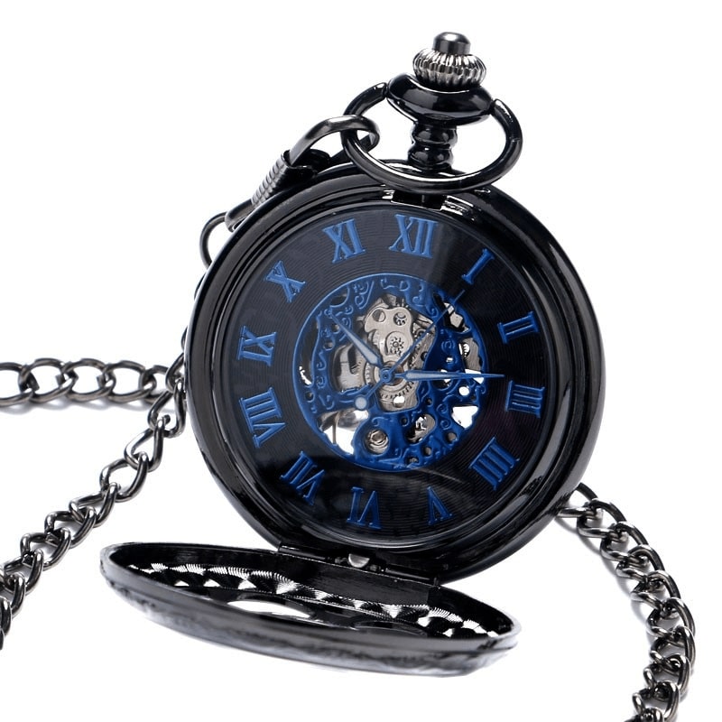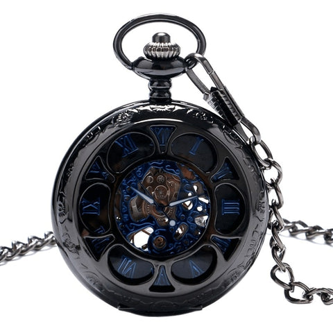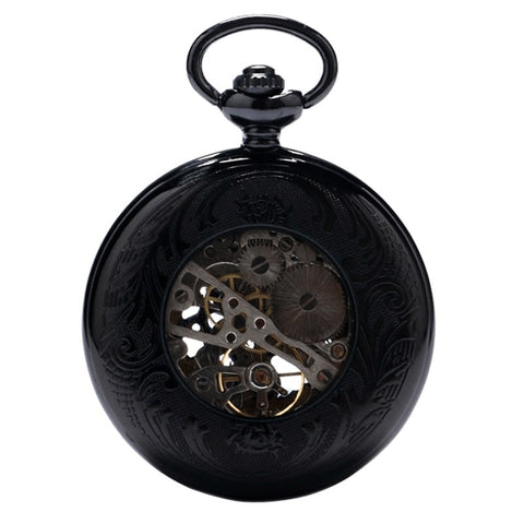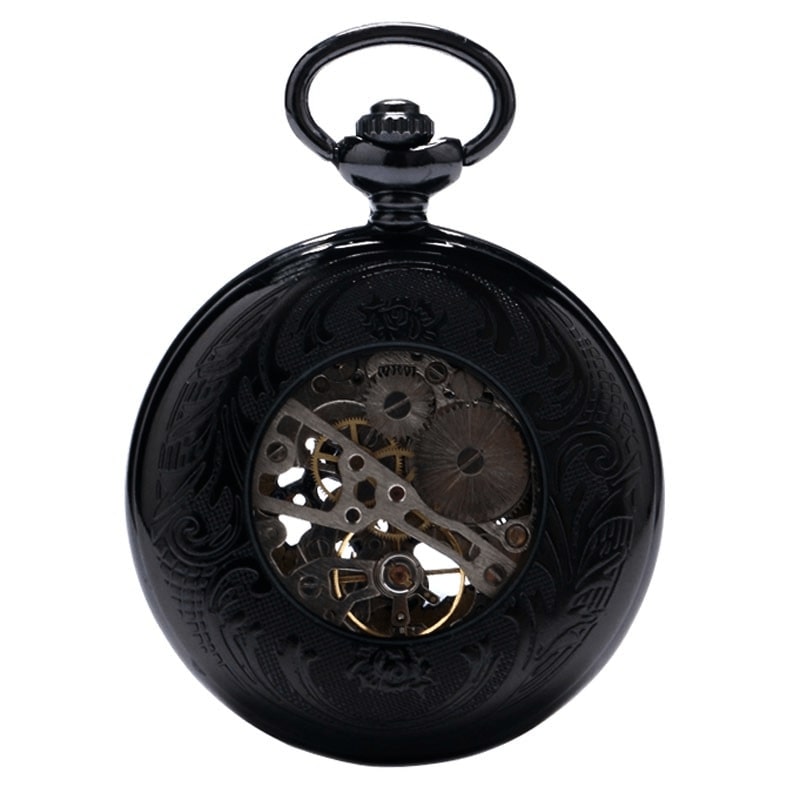 This subtle black pocket watch is the right choice if you want to remain stylish in any situation. Made from steel, it features a skeleton case that reveals the manual-wind mechanism.