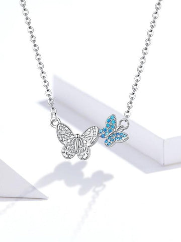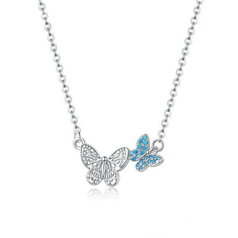 The two butterflies on the pendant of this necklace complement each other beautifully. One of them is carefully engraved to portray the complex beauty of a butterfly's wings. The other is adorned with AAA-grade blue cubic zirconia crystals, known for their sparkle and durability.