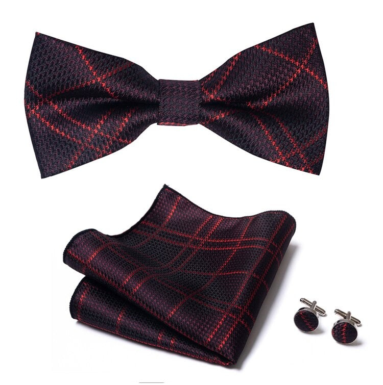 The set includes: bow tie, pocket square, and 2 cufflinks.