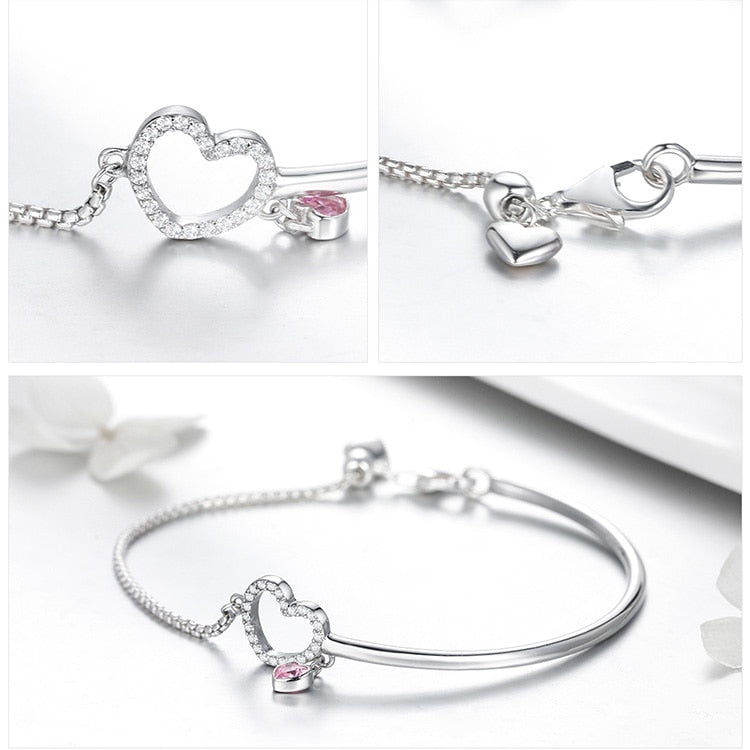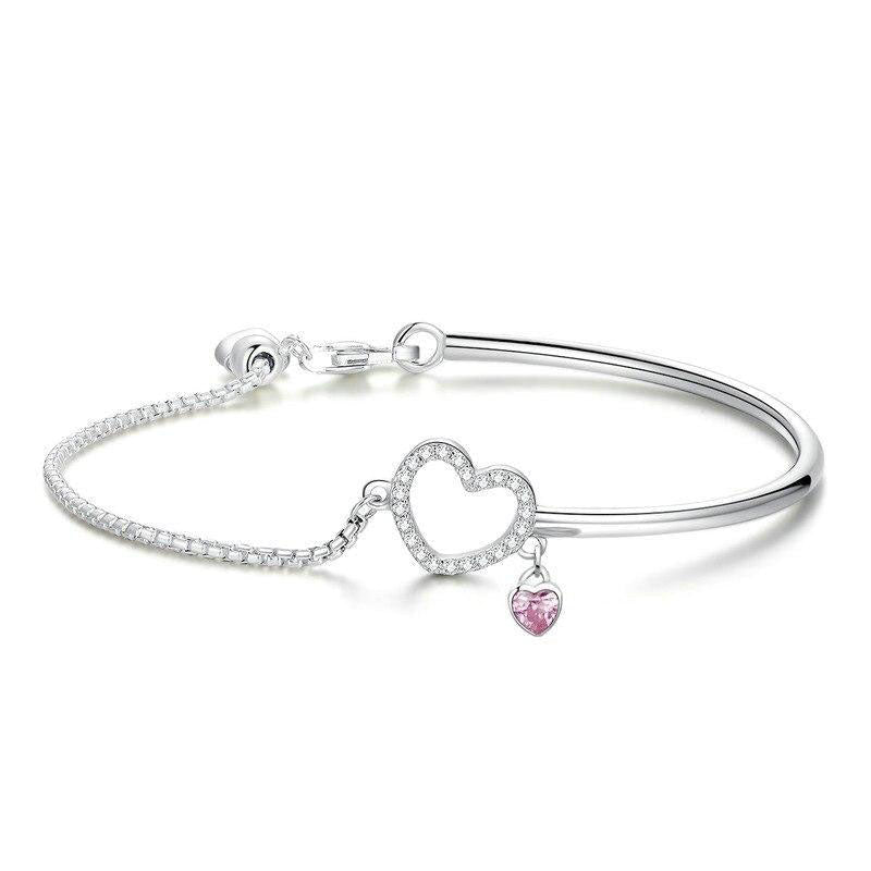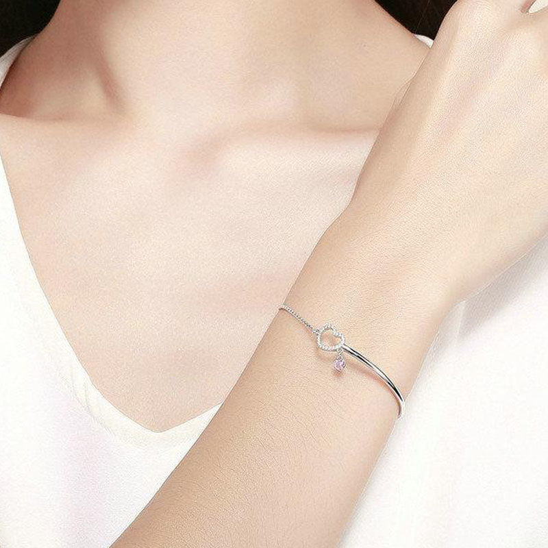 This stunning and elegant bracelet with a heart-shaped pendant offers a classic and timeless style. It is made of durable stainless steel, making it both enduring and charming. The design includes a small heart-shaped pendant with tiny rhinestone crystals in the centre, which reflect light dramatically for a unique finish. The heart is suspended from a round ring that extends upward, giving it an elegant appearance. The ends of the bracelet are curved to comfortably fit your wrist, allowing you to wear it all day without feeling discomfort. This fashionable heart bracelet features a flawless finish and a silvery shine that does not tarnish over the years. Lastly, it is flexible enough to easily slip on and off the wrist, making it perfect for special occasions or memorable evenings.