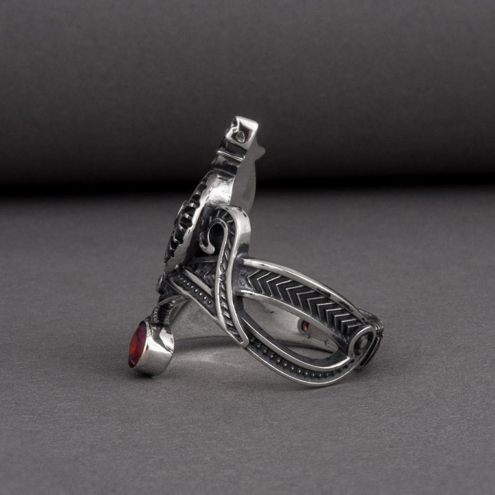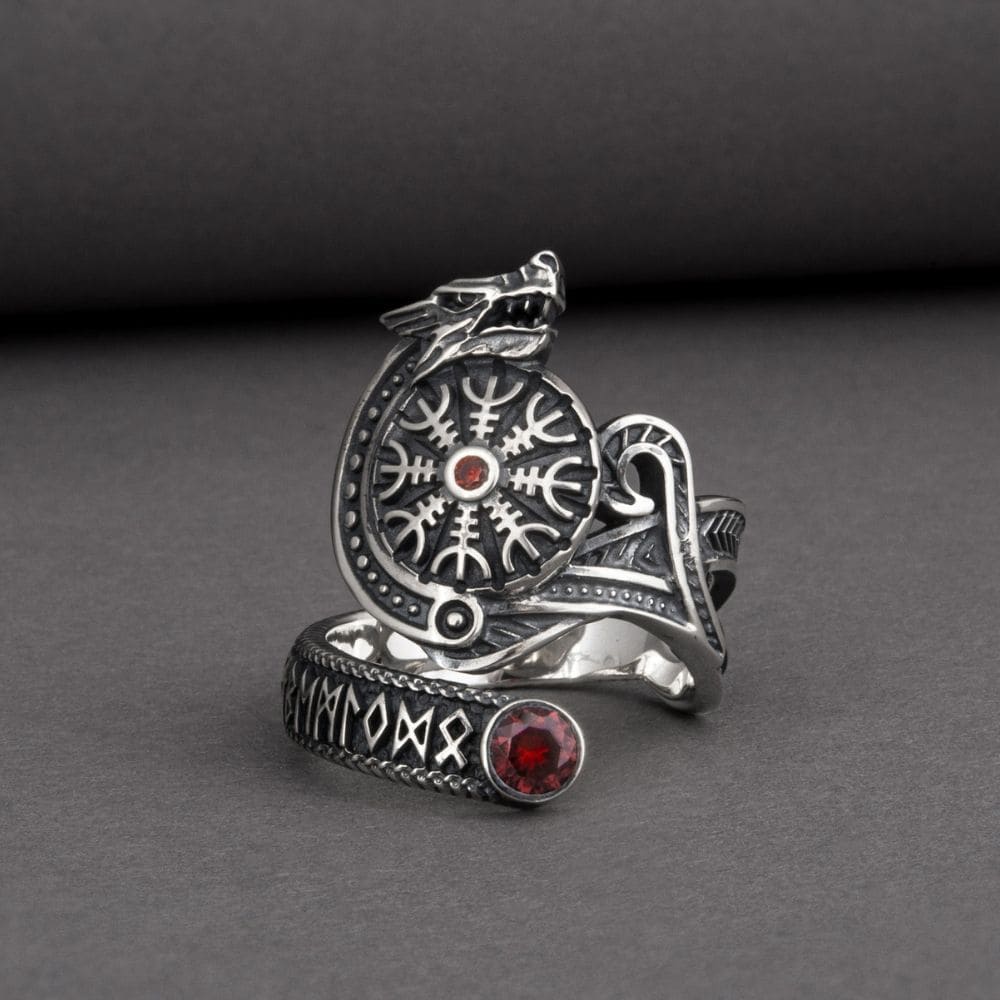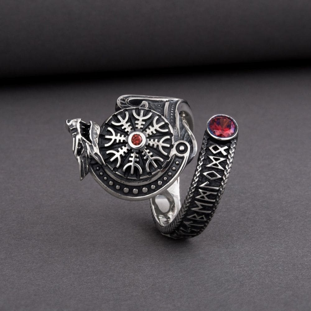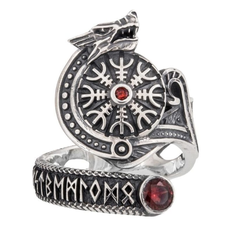 Manifest the power of the Fenrir wolf with this ring adorned with a wolf's head and the Aegishjalmur symbol. This silver ring is also decorated with a magical runic inscription. Two red stones add a unique touch to this exceptional piece of jewellery.