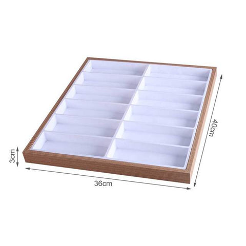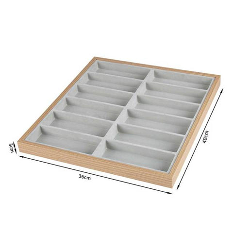 Lined with velvet and crafted from wood, the flat stand for 12 pairs of glasses is easy to store in a drawer or on a shelf. Made from high quality and durable materials.