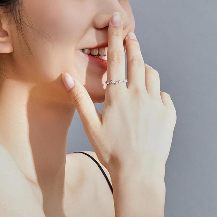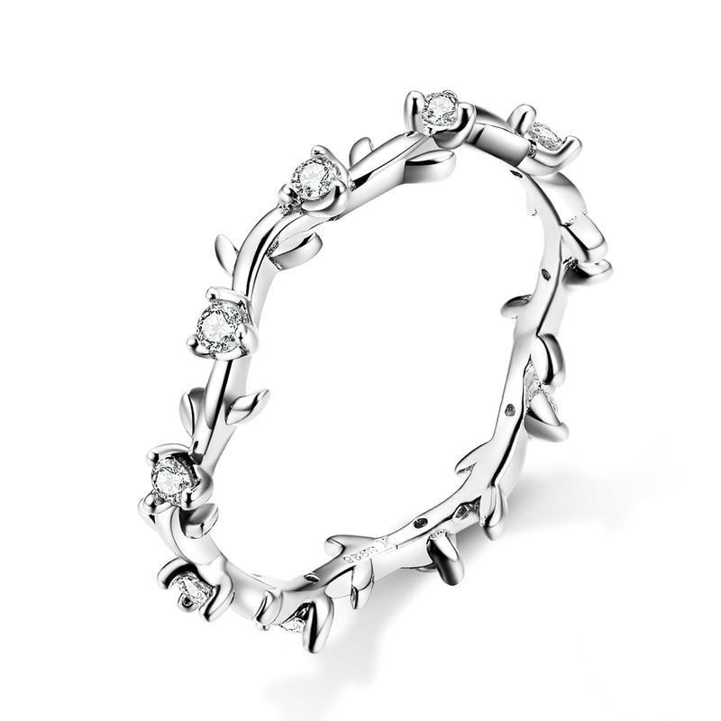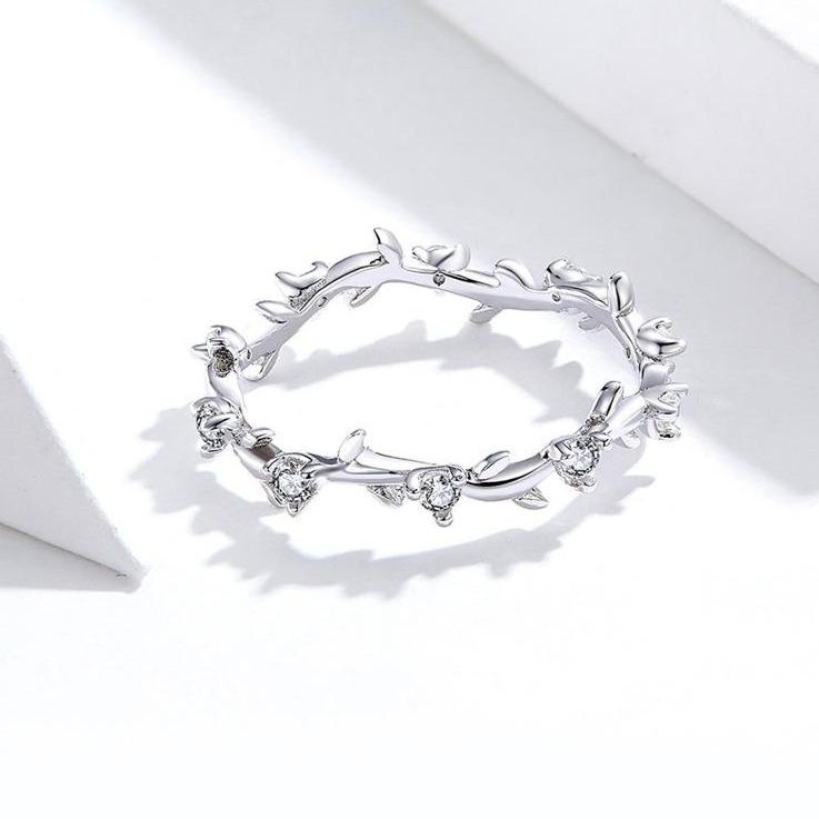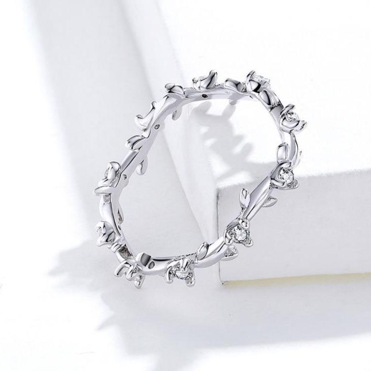 This polished silver ring is adorned with several small sparkling crystals. Moreover, its band is shaped to form a beautiful and sturdy flowered branch. Overall, it's an elegant and feminine ring.