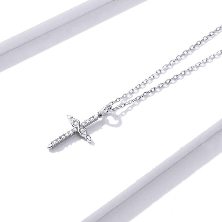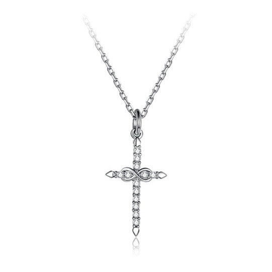 Pamper yourself with the elegance and durability of this stunning piece made in S925 silver! The simple and elegant pendant features an infinity symbol beautifully intertwined with the cross. The sparkle of the small oxide diamonds that adorn it is also striking.