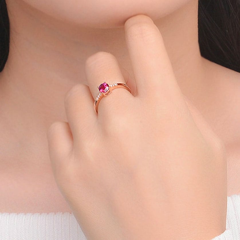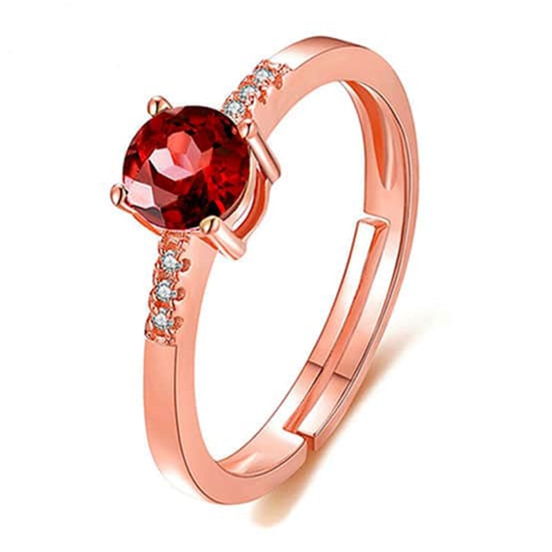 This beautiful ring in rose gold features an authentic and unique garnet stone. The red garnet helps to control anger, especially when directed at oneself. It is a stone of commitment and also symbolises love.