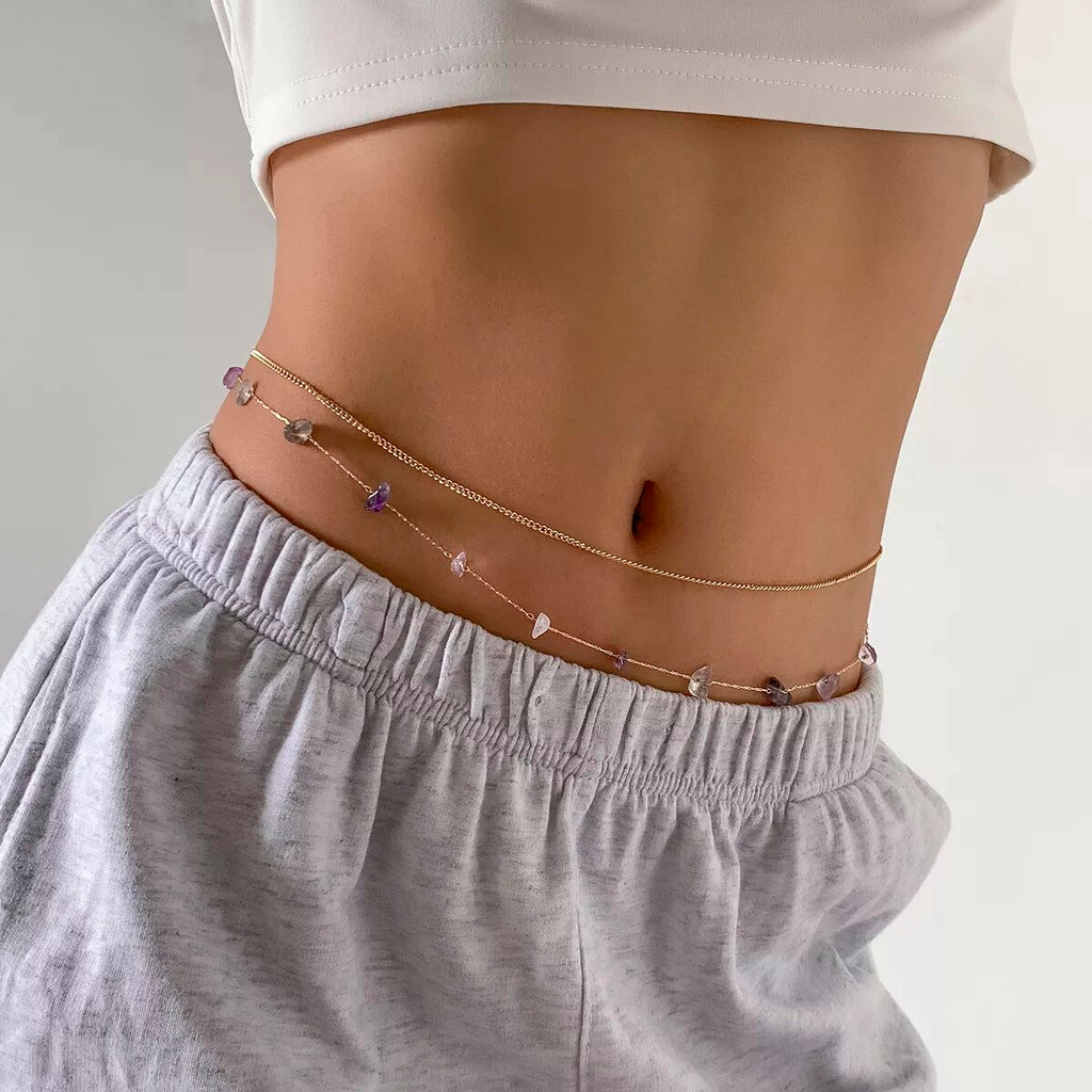 This waist chain is adorned with exceptionally shaped and coloured gemstones, offering everything you might find pleasing. This piece is the perfect combination of femininity and exuberance.
