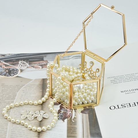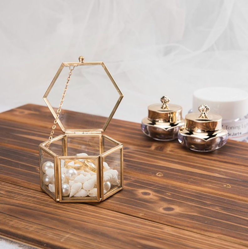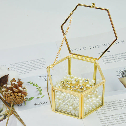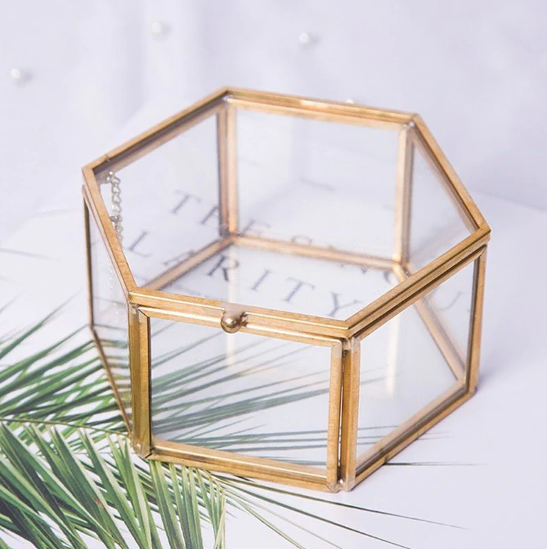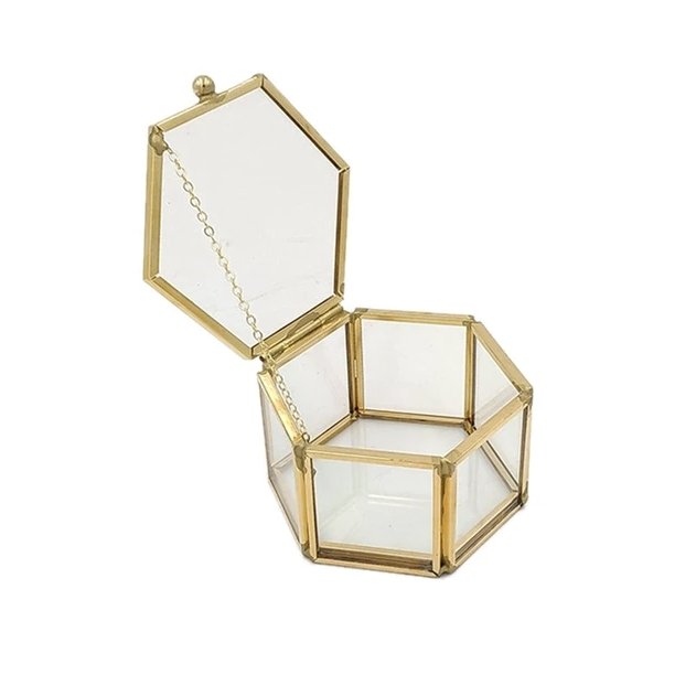 This Glass and Metal Jewellery Box is both a practical and decorative accessory. Made of glass with high-quality gold-plated brass detailing, this jewellery box brings a vintage charm to your home. The transparent glass sides let you keep your precious pieces in view at all times. Its geometric shape adds a stylish edge, and the lid is held open by a small chain. This box also makes a thoughtful gift idea for a proposal.