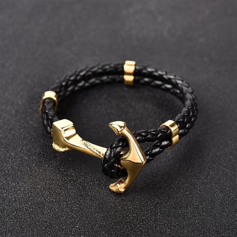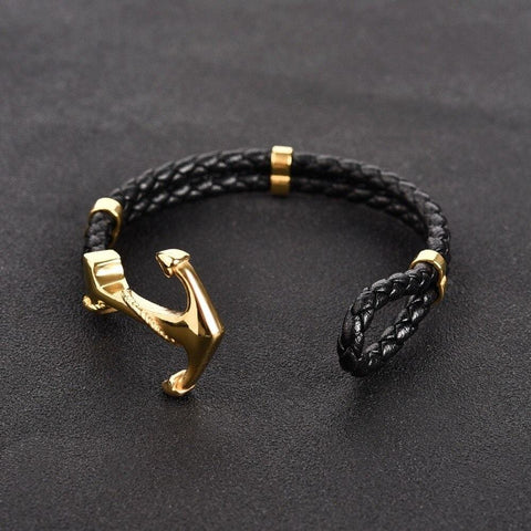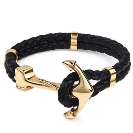 This men's bracelet with anchor features a golden stainless steel nautical anchor and a braided leather strap, with a bold and masculine design that perfectly matches a dark and seductive look.